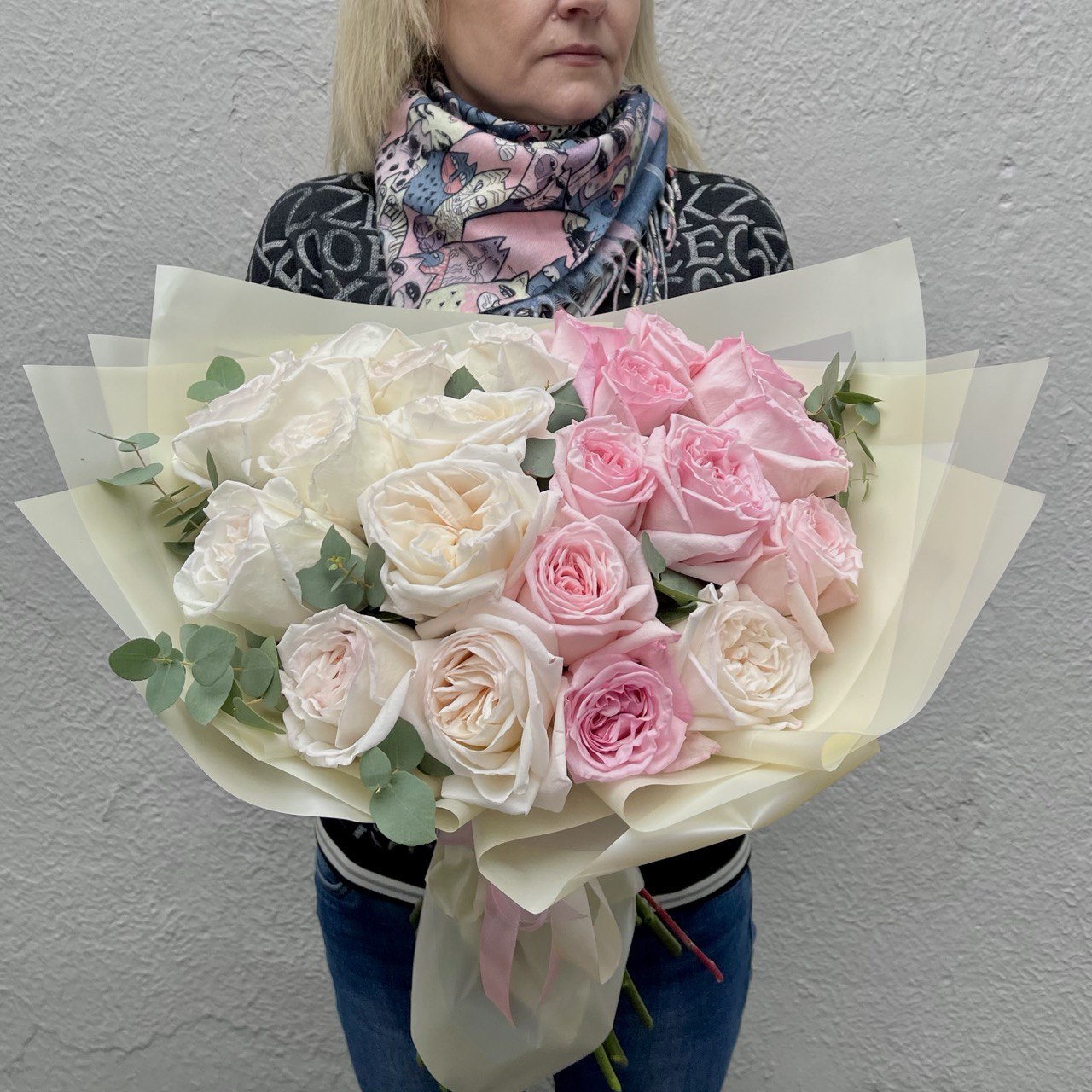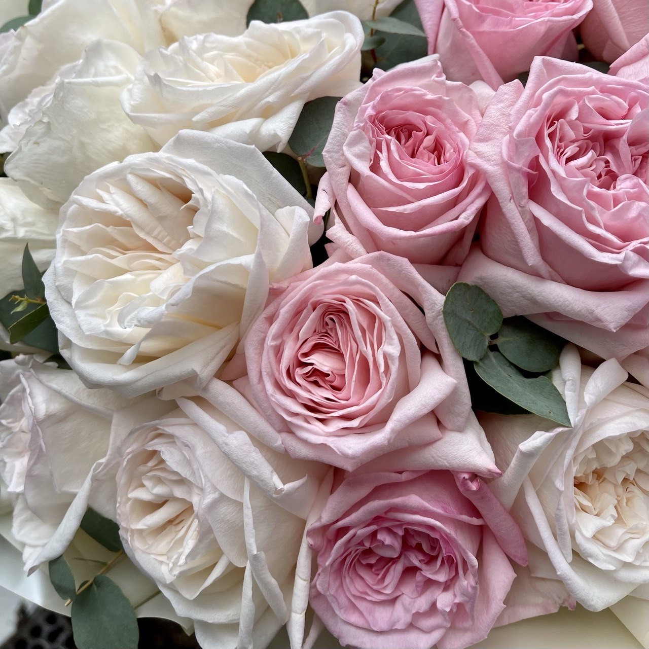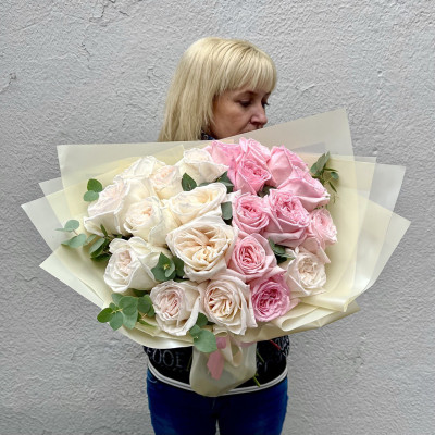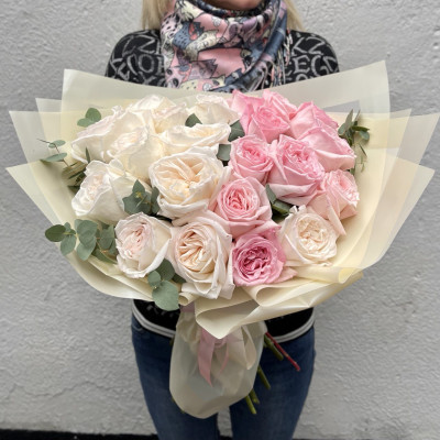Роза пионовидная «Вайт Охара» — 9 шт., роза пионовидная «Пинк Охара» — 10 шт., эвкалипт, фирменная упаковка, атласная лента.
