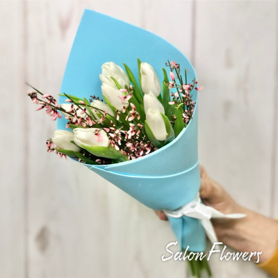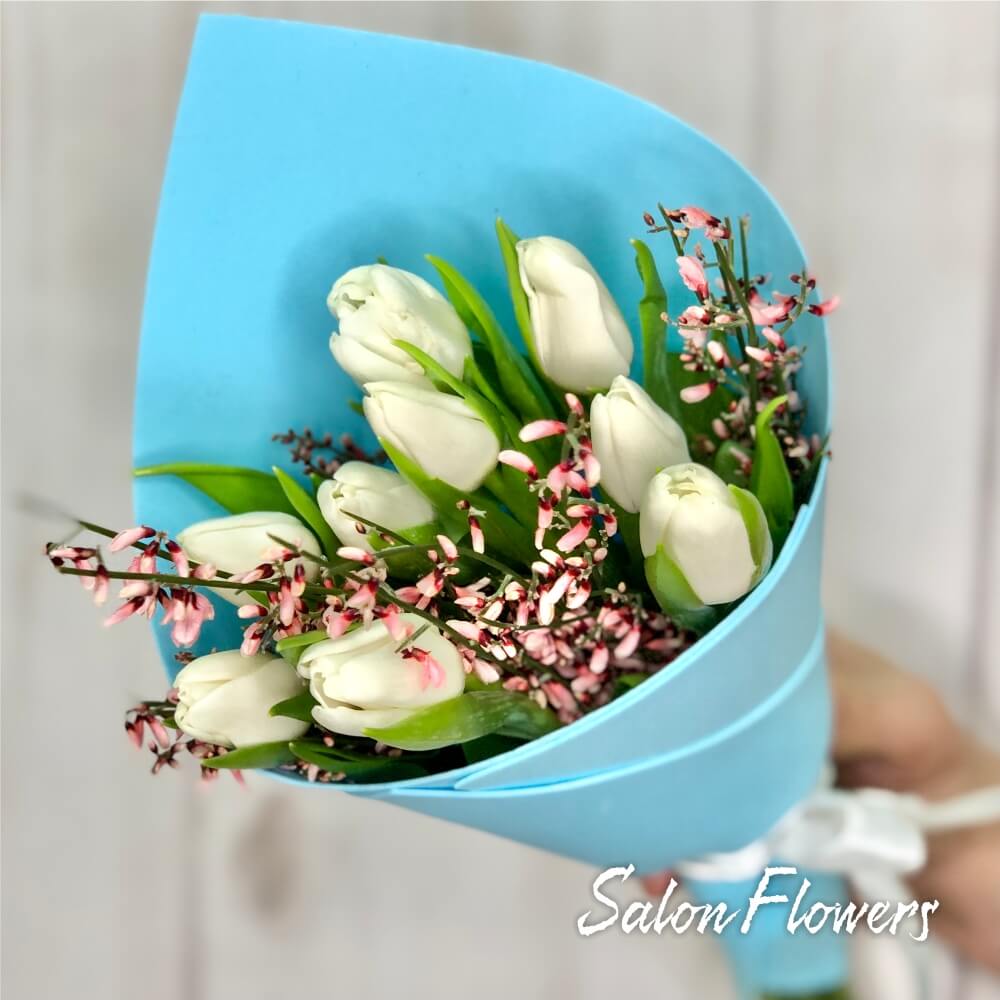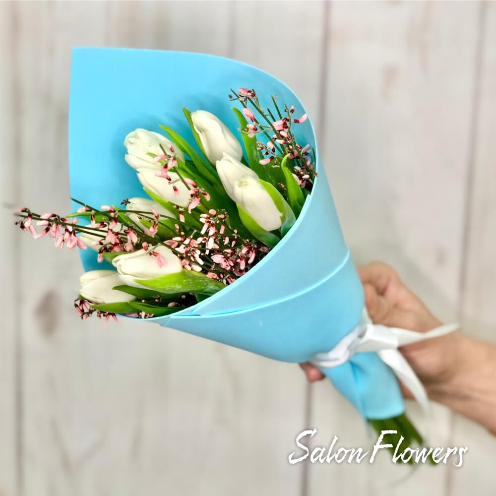 Тюльпан белый — 9 шт., гениста розовая, фирменная упаковка, атласная лента.