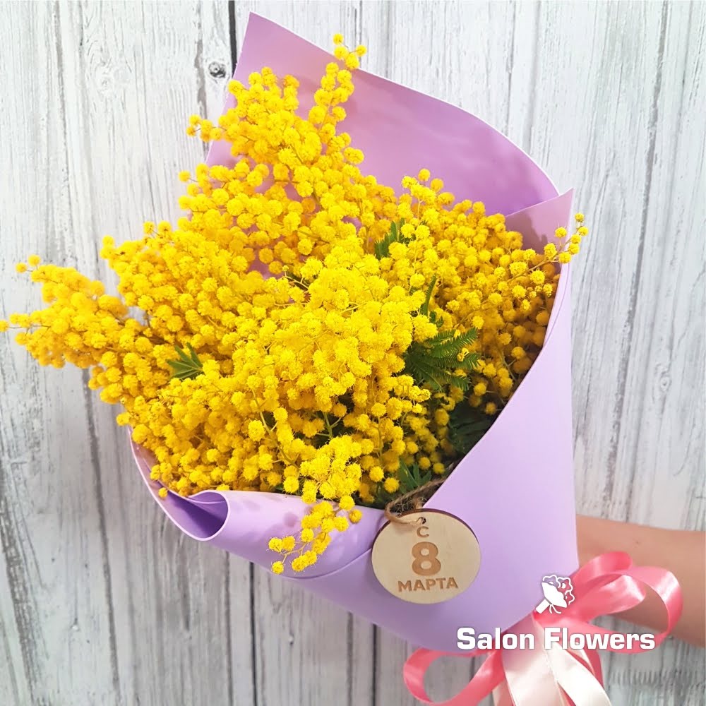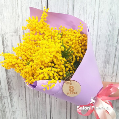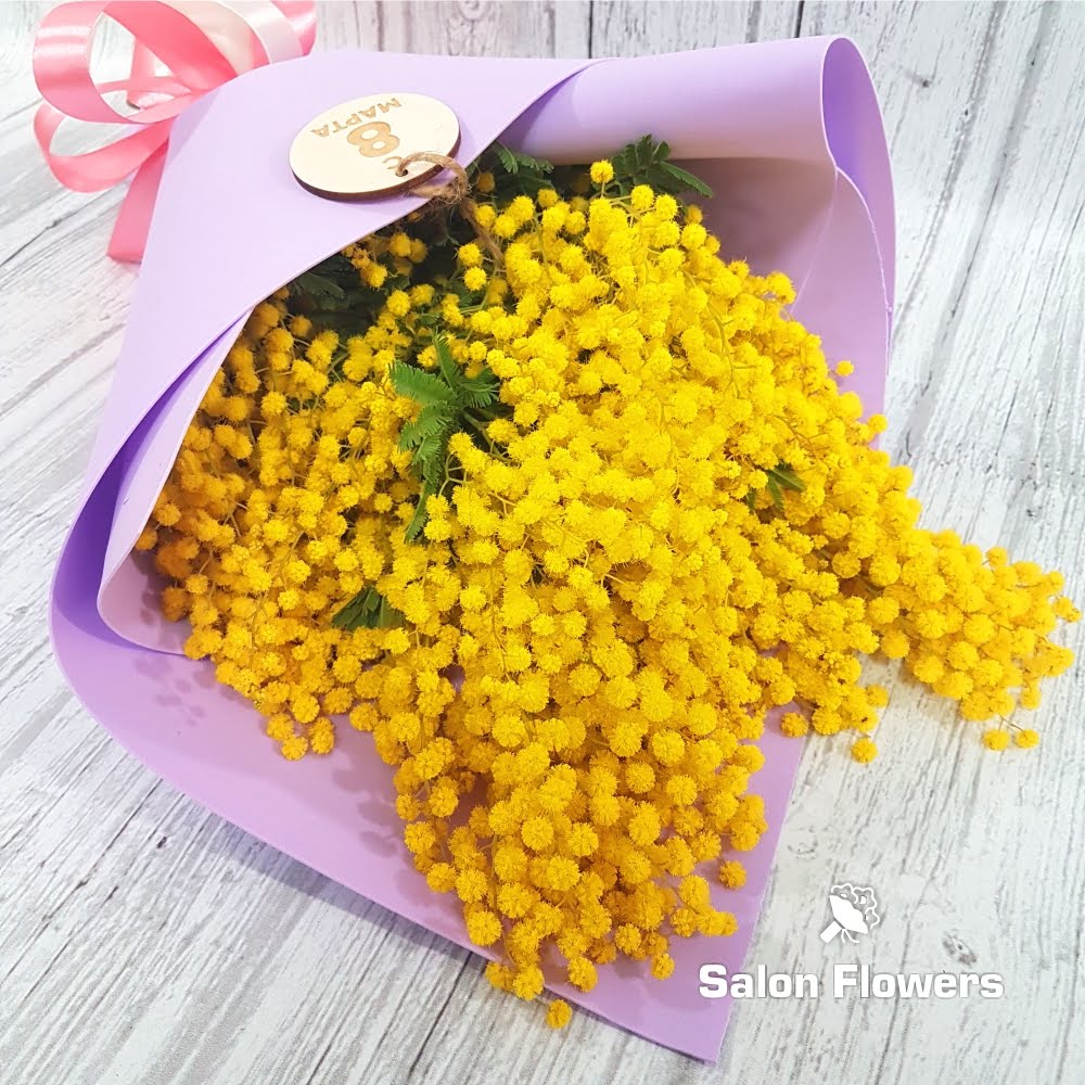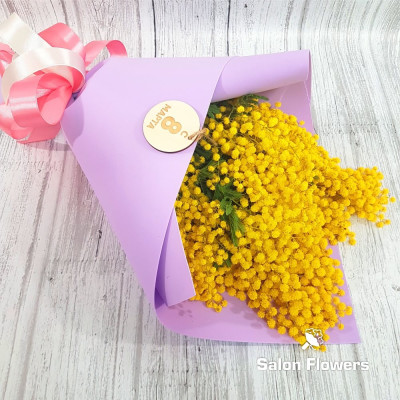 Мимоза Итальянская — 1 банч, шильдик «С 8 Марта», фирменная упаковка, атласная лента.