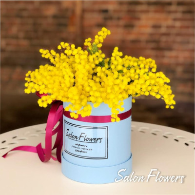 Мимоза Итальянская — 0,5 банча, шляпная коробка (15 х 15 см), флористическая губка, атласная лента.