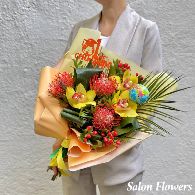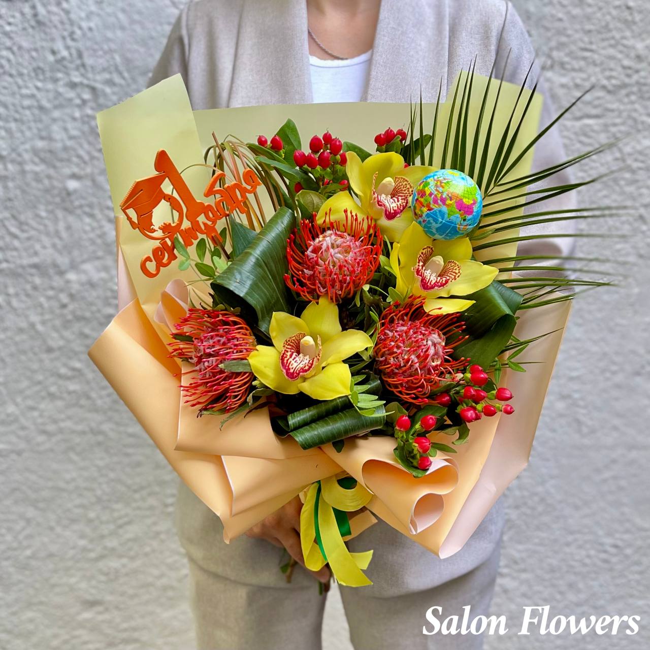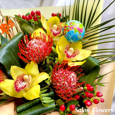 Орхидея (цимбидиум) желтая — 3 шт., нутанс — 3 шт., гиперикум красный — 2 шт., зелень, декор: планета — 1 шт., топпер — 1 шт., фирменная упаковка, атласная лента.