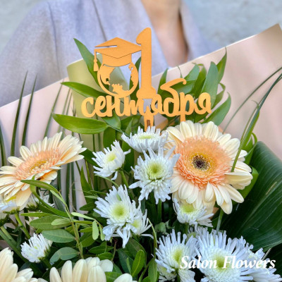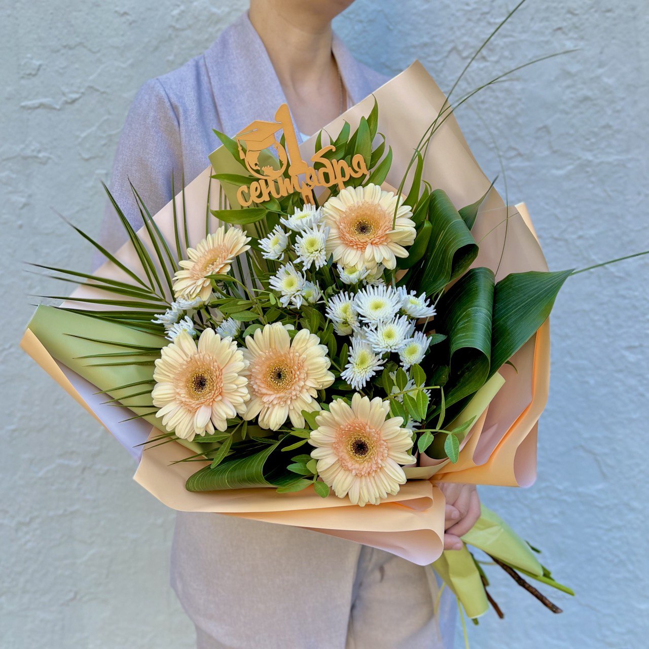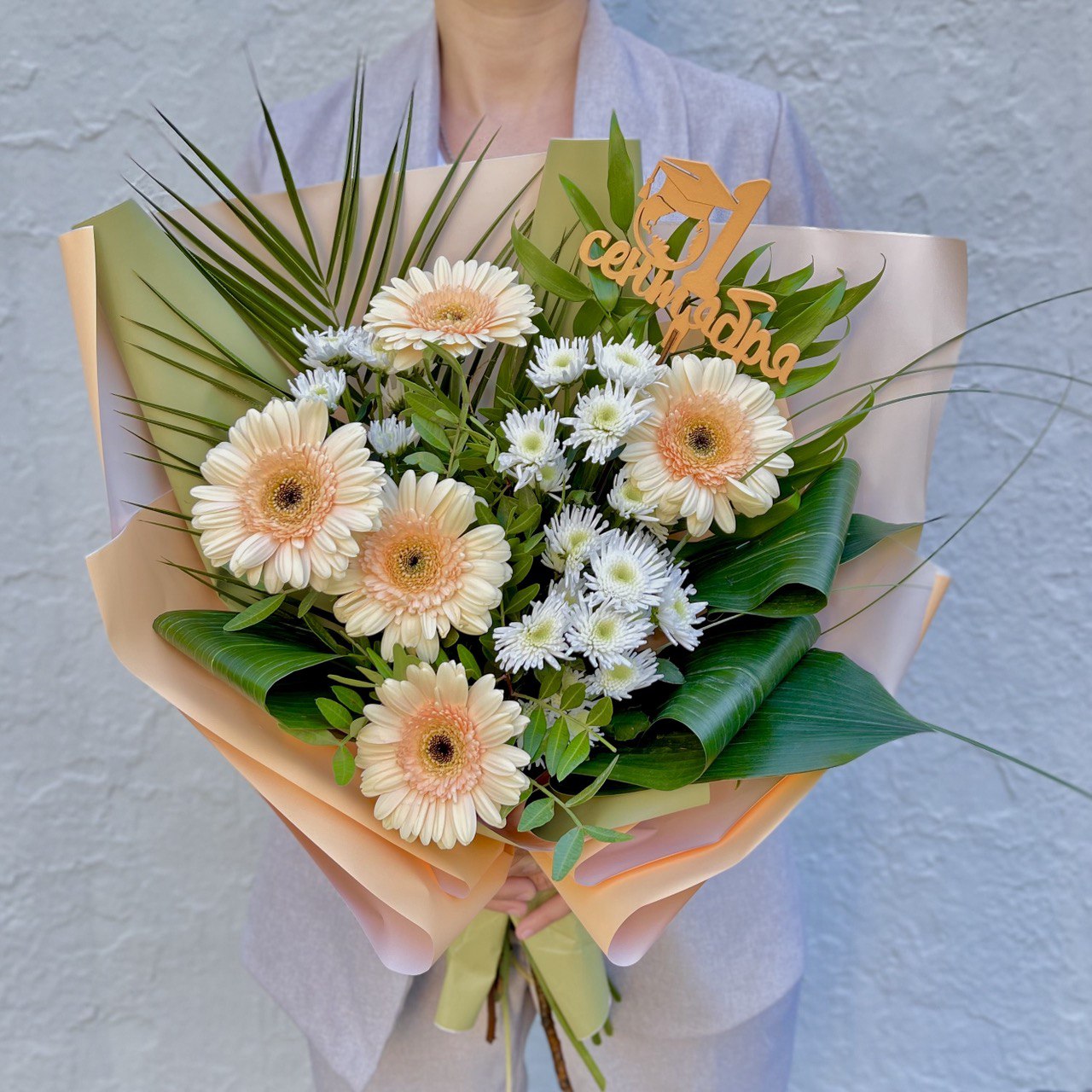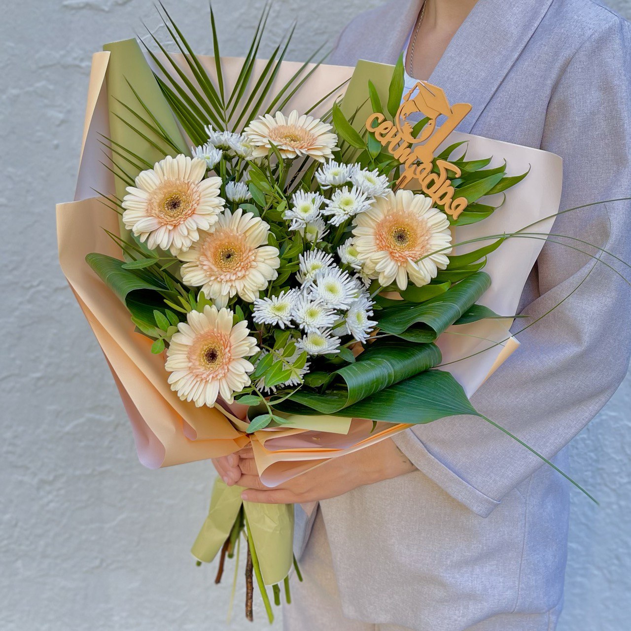 Гермини — 5 шт., хризантема (сантини) кустовая — 3 шт., аспидистра — 3 шт., робелини — 1 шт., зелень, декор: топпер, фирменная упаковка, атласная лента.