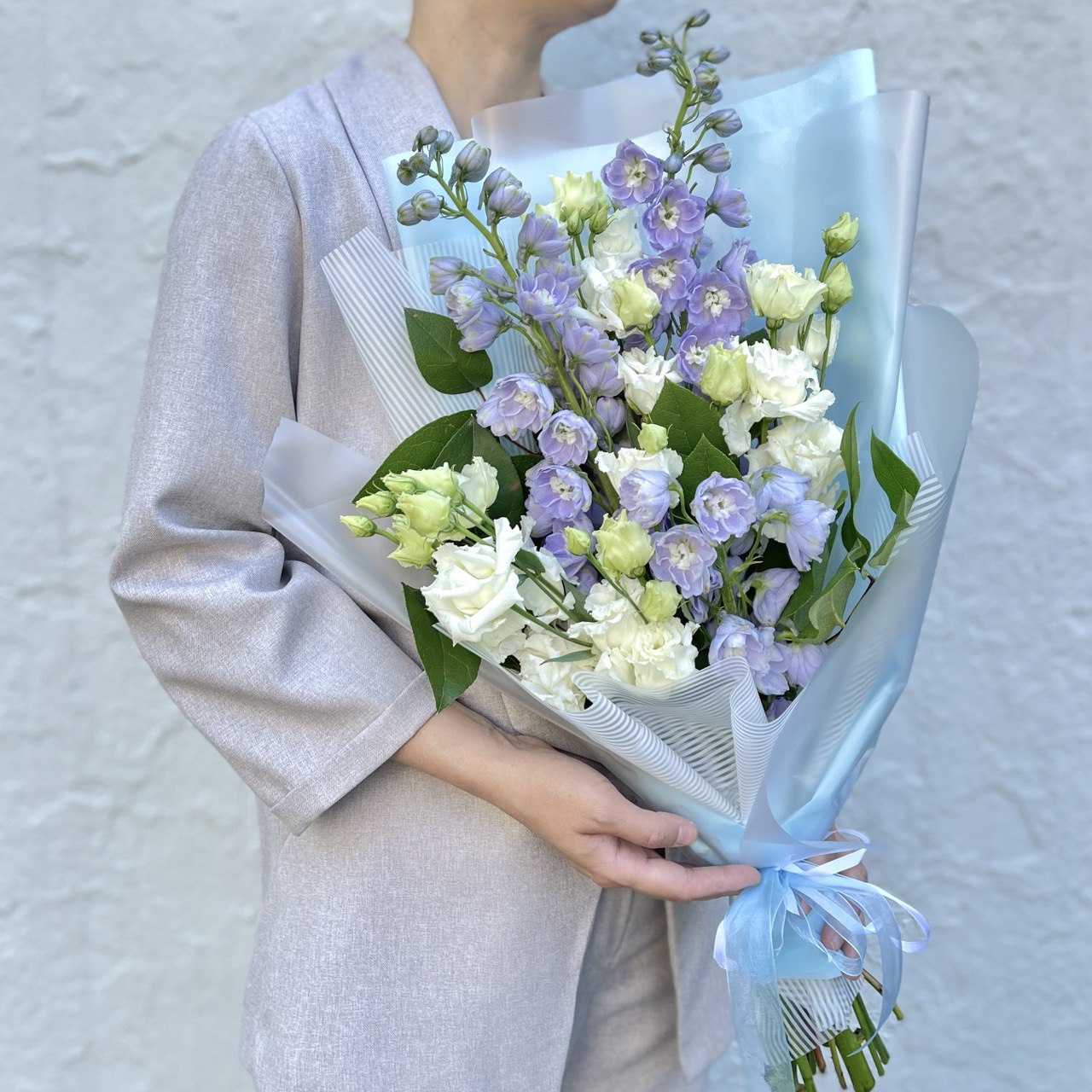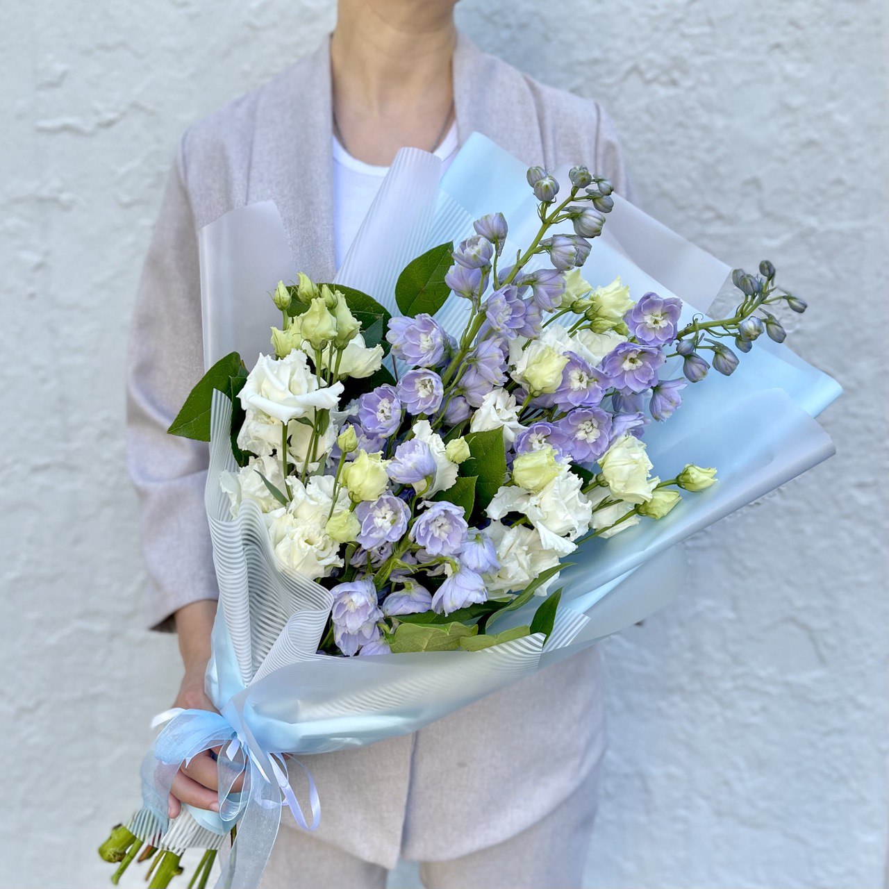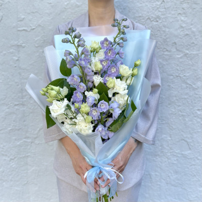 Дельфиниум голубой — 3 шт., эустома «Розита» — 3 шт., зелень, фирменная упаковка, атласная лента.