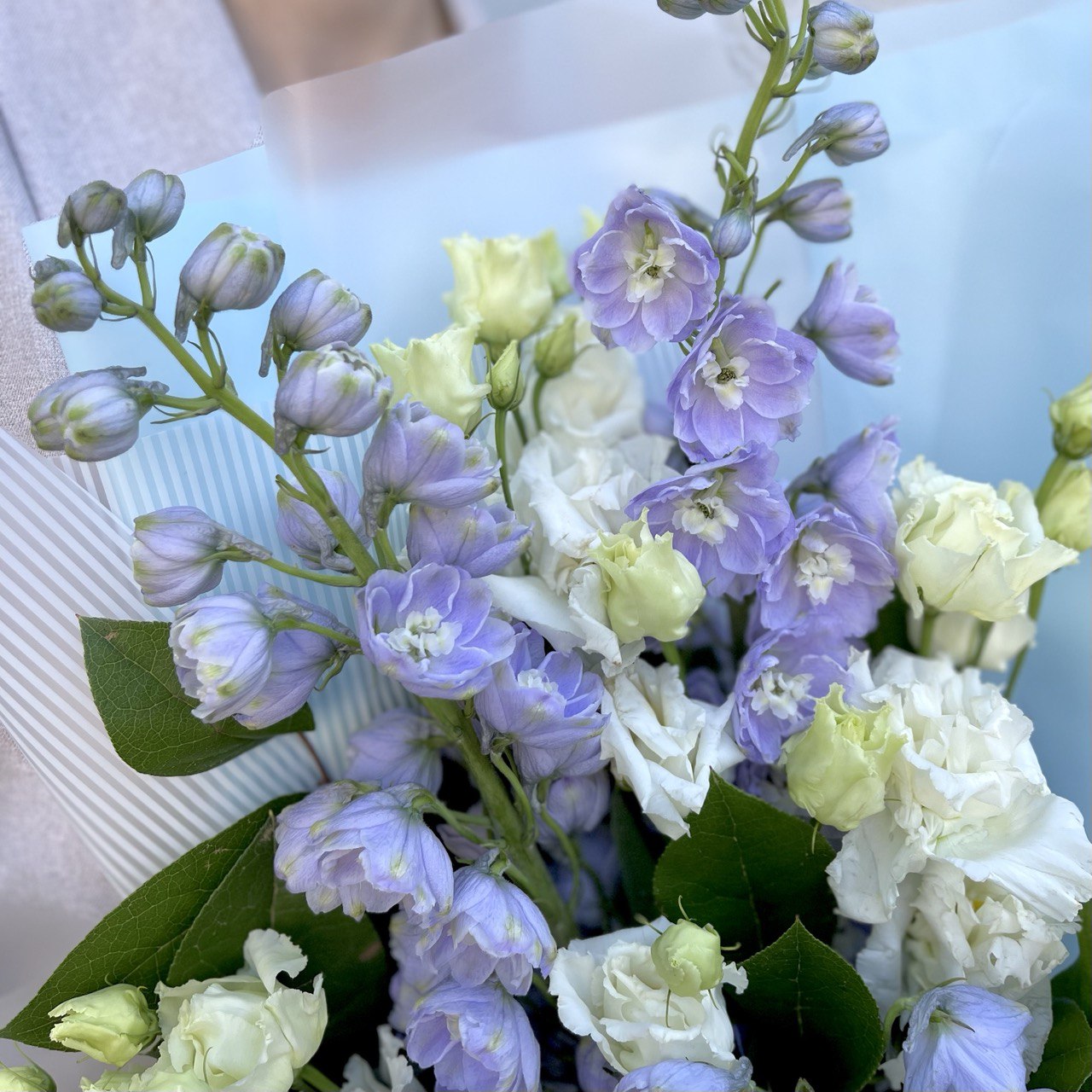 - Уникальный состав: Комбинация дельфиниума голубого и эустомы "Розита" создает неповторимый и очаровательный букет, который точно понравится получателю.