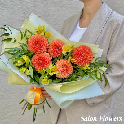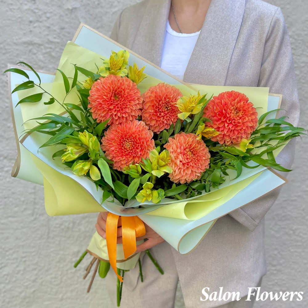 Георгина — 5 шт., альстромерия — 4 шт., зелень, фирменная упаковка, атласная лента.
