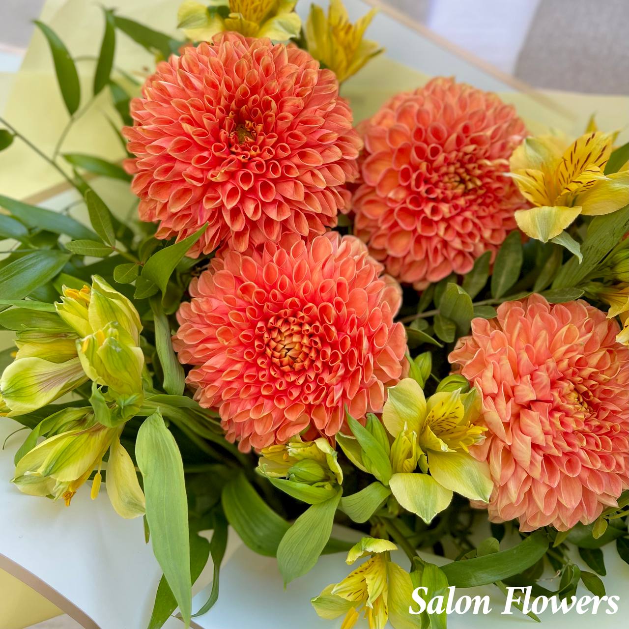 - Альстромерии (4 шт.): Эти элегантные цветы с нежными лепестками олицетворяют дружбу, заботу и уважение. Альстромерии в букете Далияна привносят нотку изящества и утонченности, дополняя красоту георгин.