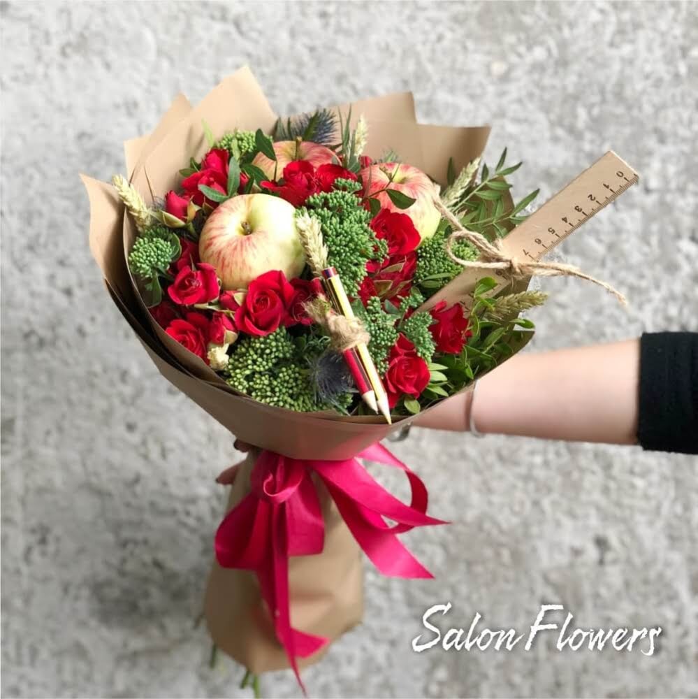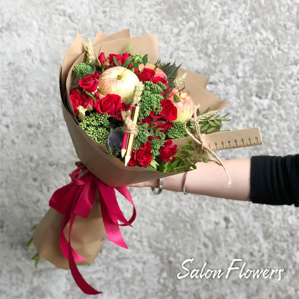 Роза кустовая — 5 шт., яблоки — 3 шт., трахелиум — 4 шт., пшеница — 5 шт., школьный декор, фирменная упаковка, атласная лента.
