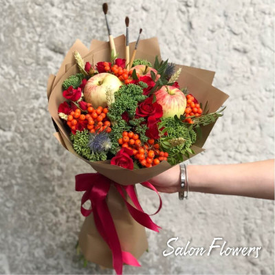 Роза кустовая красная — 5 шт., яблоки — 3 шт., трахелиум — 4 шт., пшеница — 5 шт., рябина — 3 шт., кисточки — 3 шт., фирменная упаковка, атласная лента.