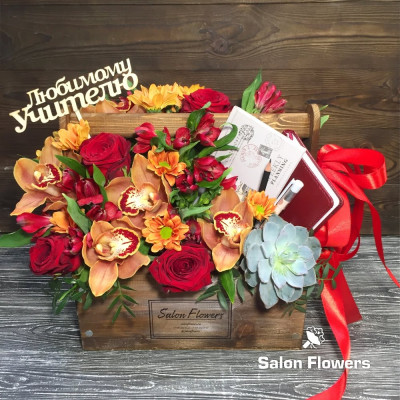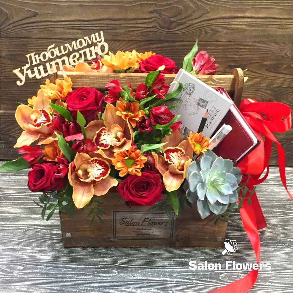 Подарок от всего сердца: Ящик любимому учителю с цветами и школьными принадлежностями