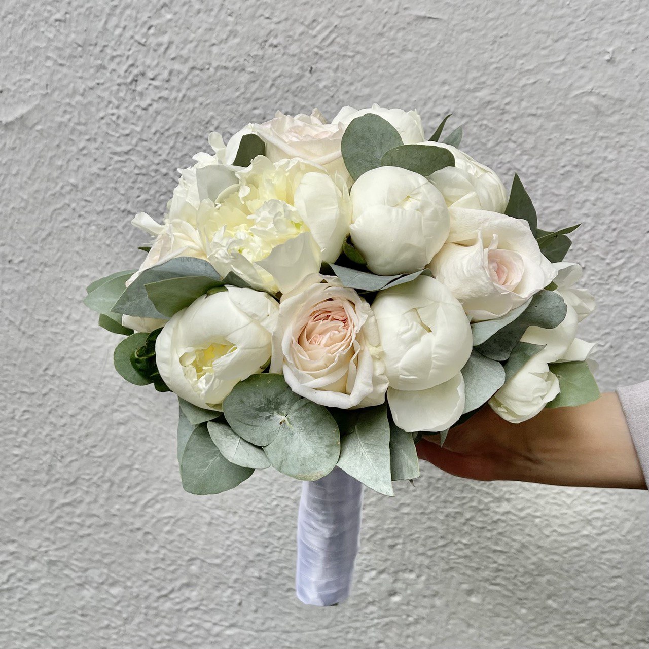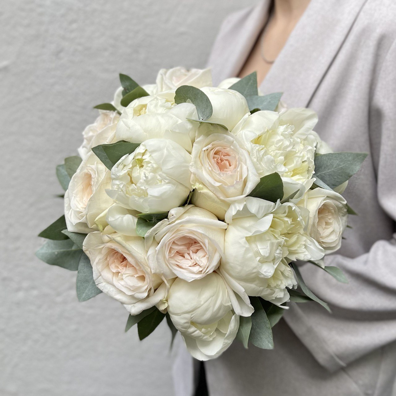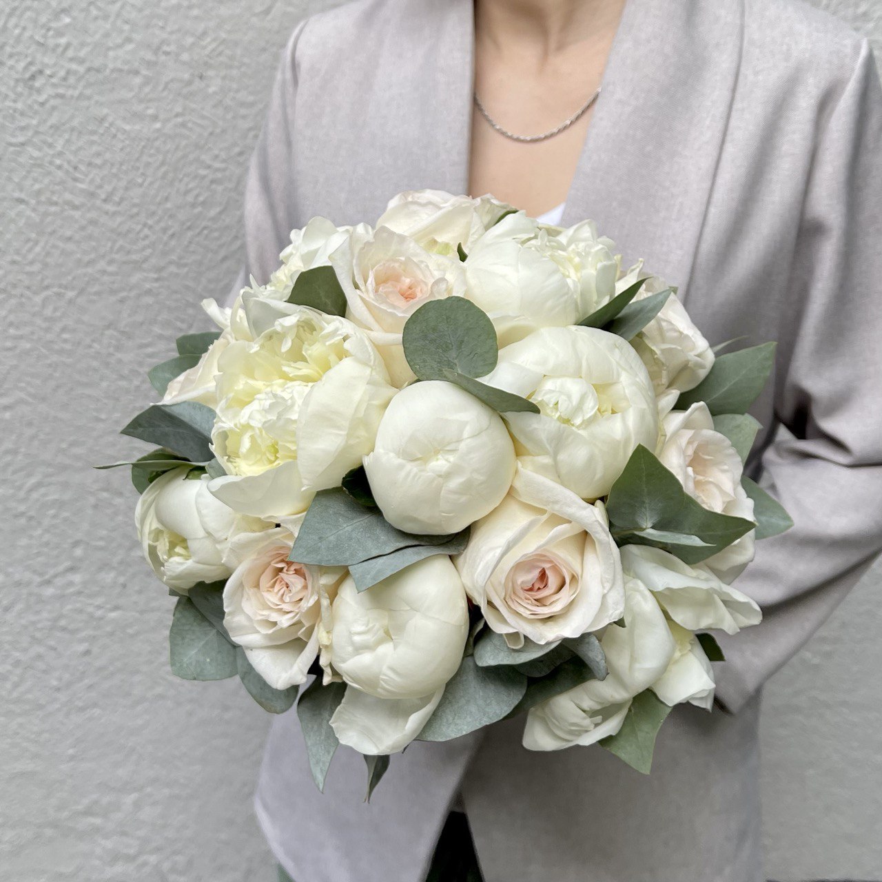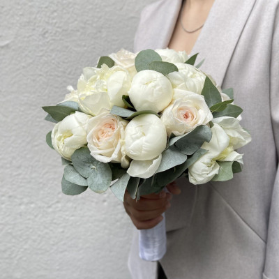 В этом роскошном букете сочетаются пышные пионы и нежные розы, а также ароматный эвкалипт. Десять белоснежных пионов сорта «Дюшес» с бархатистыми лепестками и изящными формами создают атмосферу роскоши и торжественности.