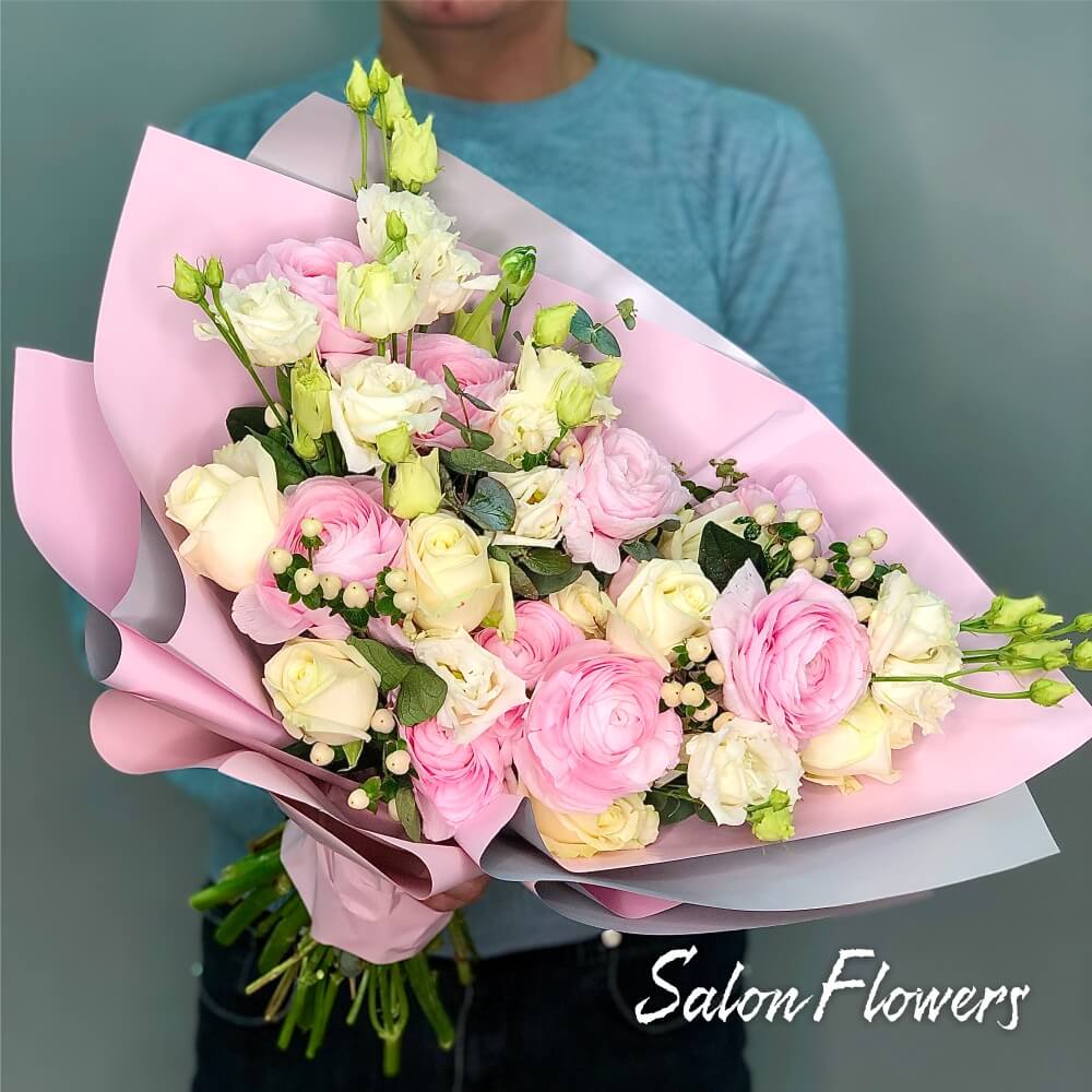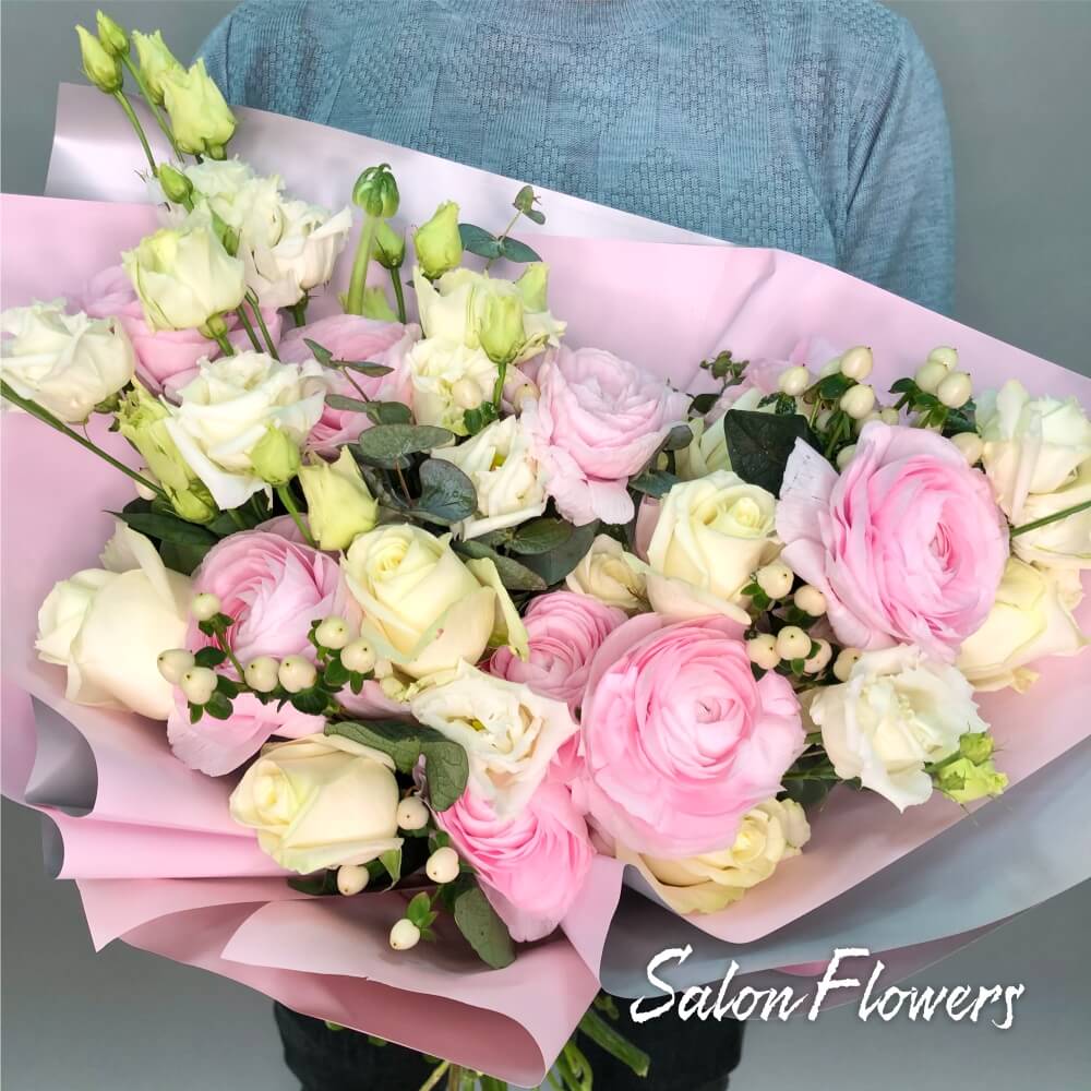 Ранункулюс — 10 шт., эустома «Алиса Вайт» — 5 шт., роза «Россия Аваланш» — 10 шт., гиперикум белый — 5 шт., эвкалипт, зелень, фирменная упаковка, атласная лента.