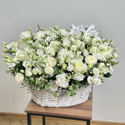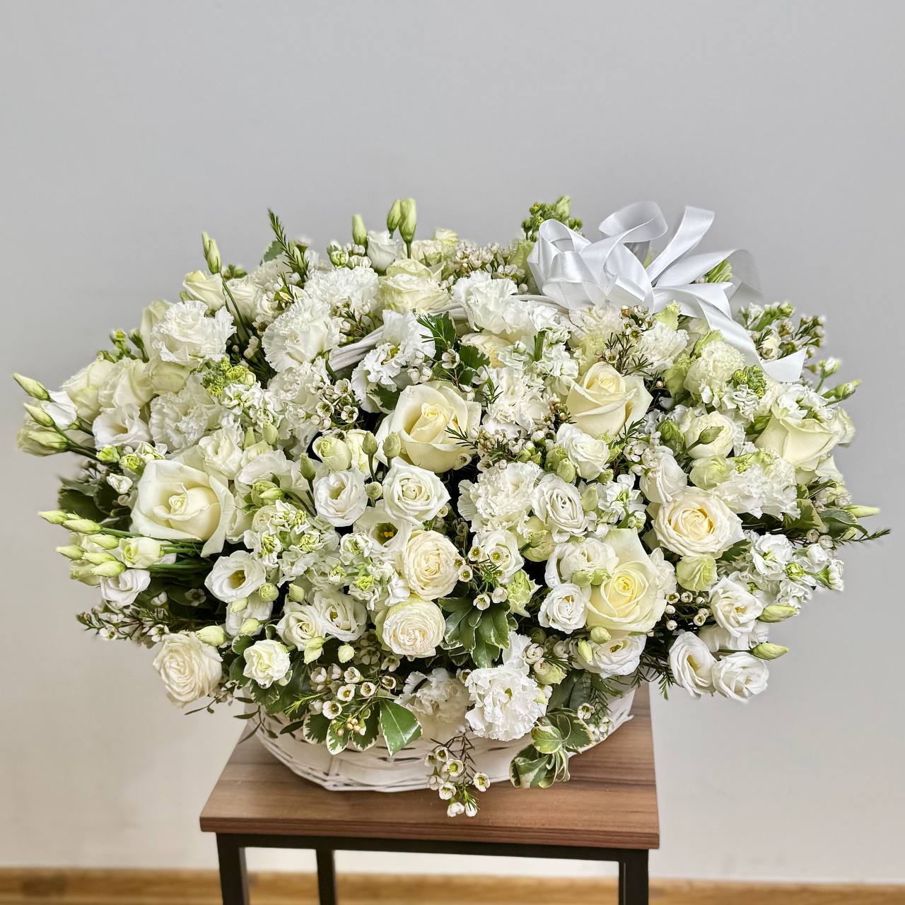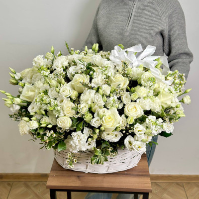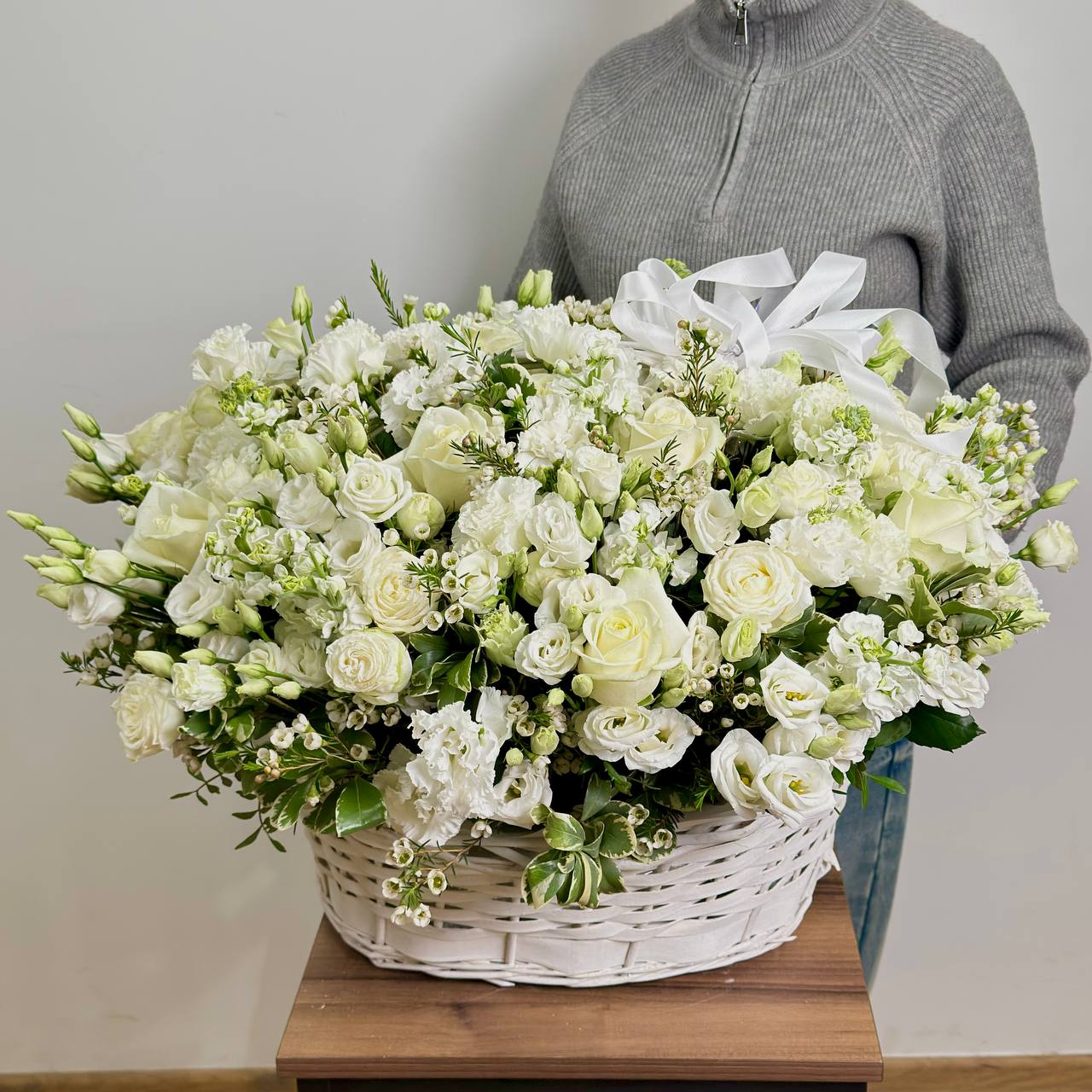 Корзина «Вайт» — это воплощение чистоты и утончённой нежности, где каждый элемент словно соткан из света. Изысканная монохромная композиция дышит спокойствием и элегантностью, даря ощущение безмятежности и гармонии.