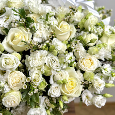 Эустома «Розита» — 20 шт., роза «Россия Аваланш» — 10 шт., роза кустовая белая — 10 шт., маттиола кустовая белая — 20 шт., озотамнус — 10 шт., питоспорум, зелень, корзина средняя, флористическая губка, атласная лента.