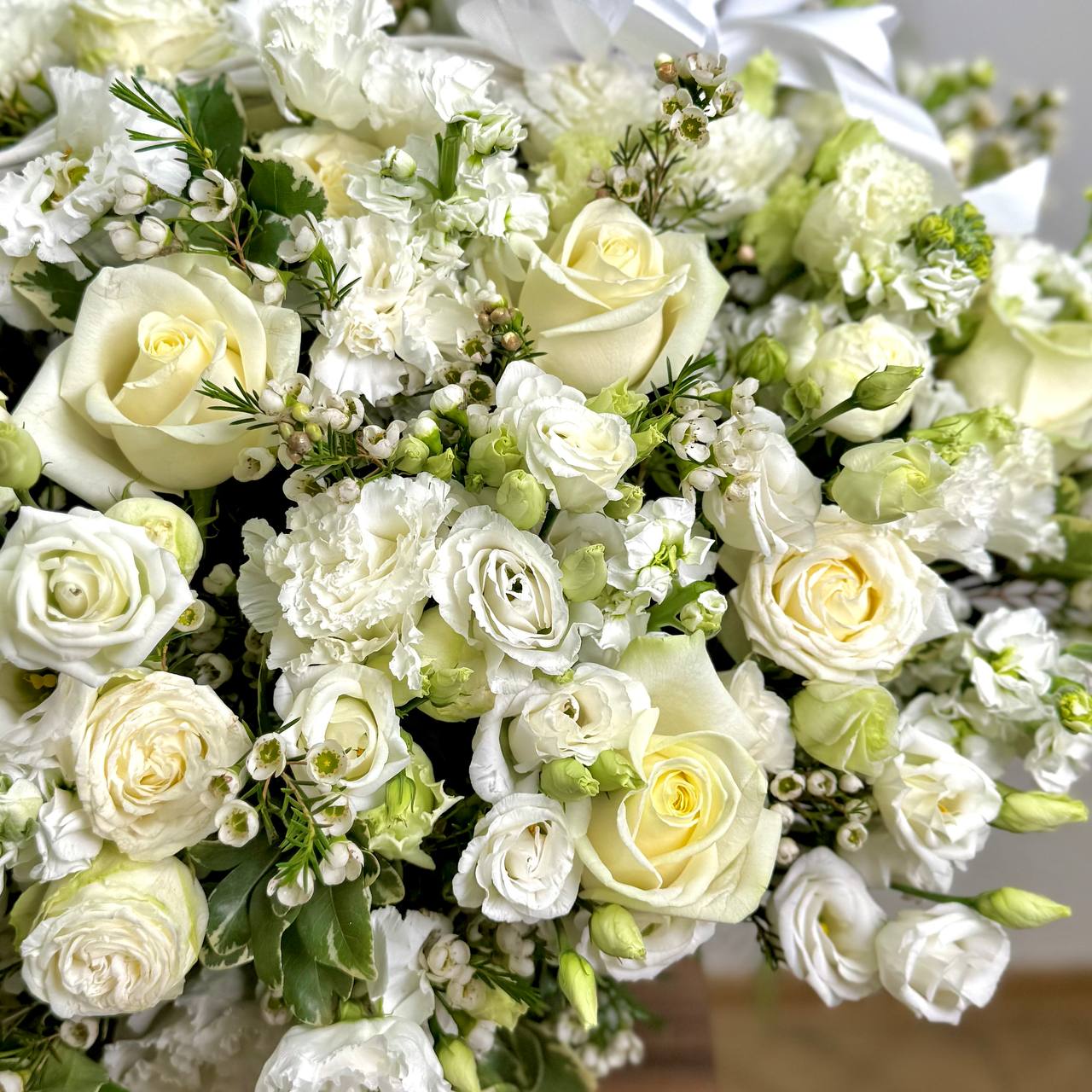 Дополняют образ изысканные штрихи зелени и питоспорум — их мягкие, серебристо‑зелёные оттенки подчёркивают чистоту белых цветов, добавляя глубины и природной естественности. Атласная лента, бережно обхватывающая корзину, привносит ноту торжественности и завершённости, не нарушая при этом общей лаконичности образа.