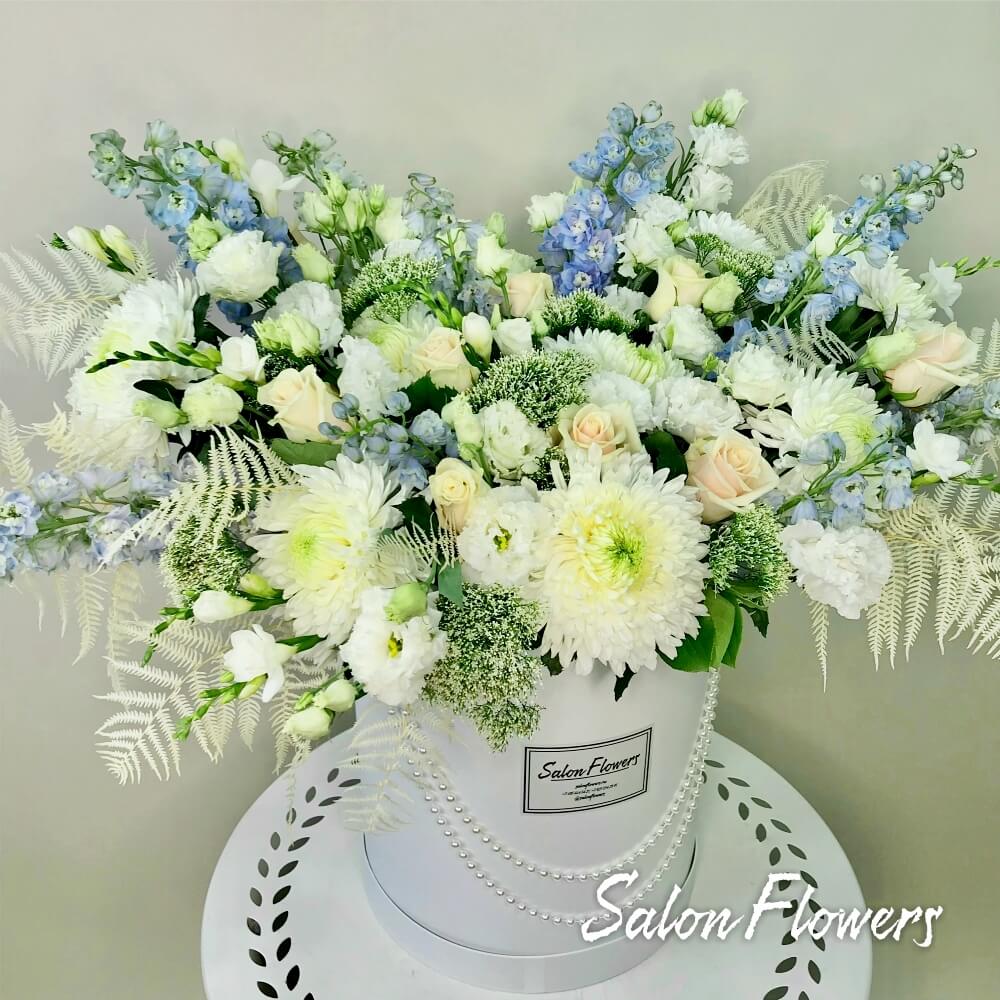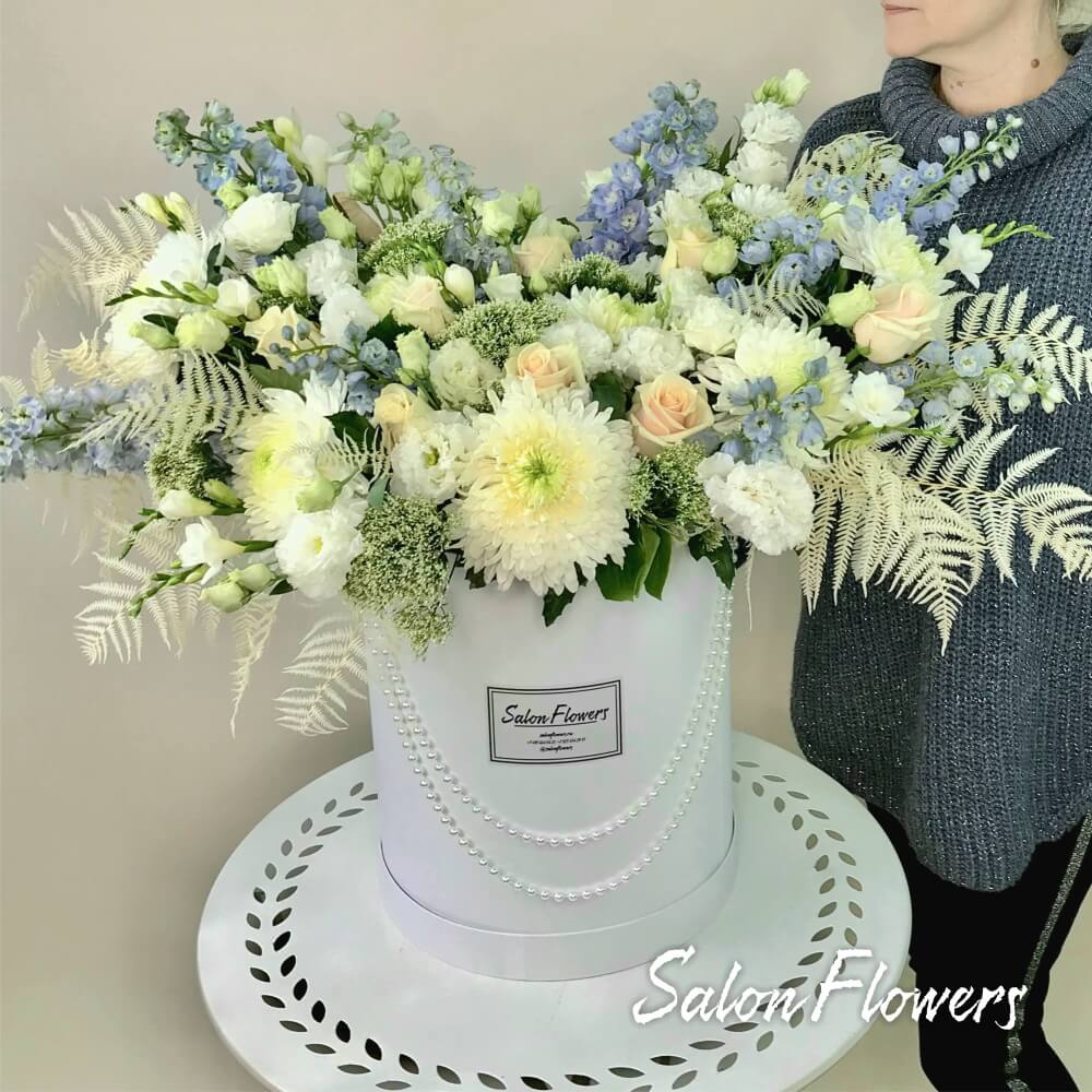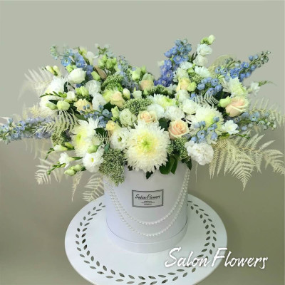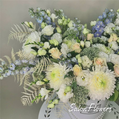 Хризантема одноголовая — 10 шт., дельфиниум голубой — 10 шт., эустома «Розита» — 10 шт., трахелиум — 10 шт., роза «Россия Талея» — 10 шт., папоротник стабилизированный — 2 шт., зелень, шляпная коробка (30 х 35 см), флористическая губка, декор-бусы.