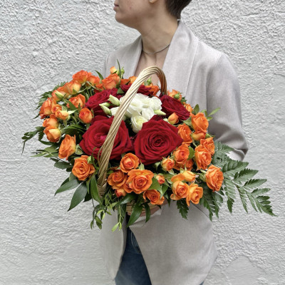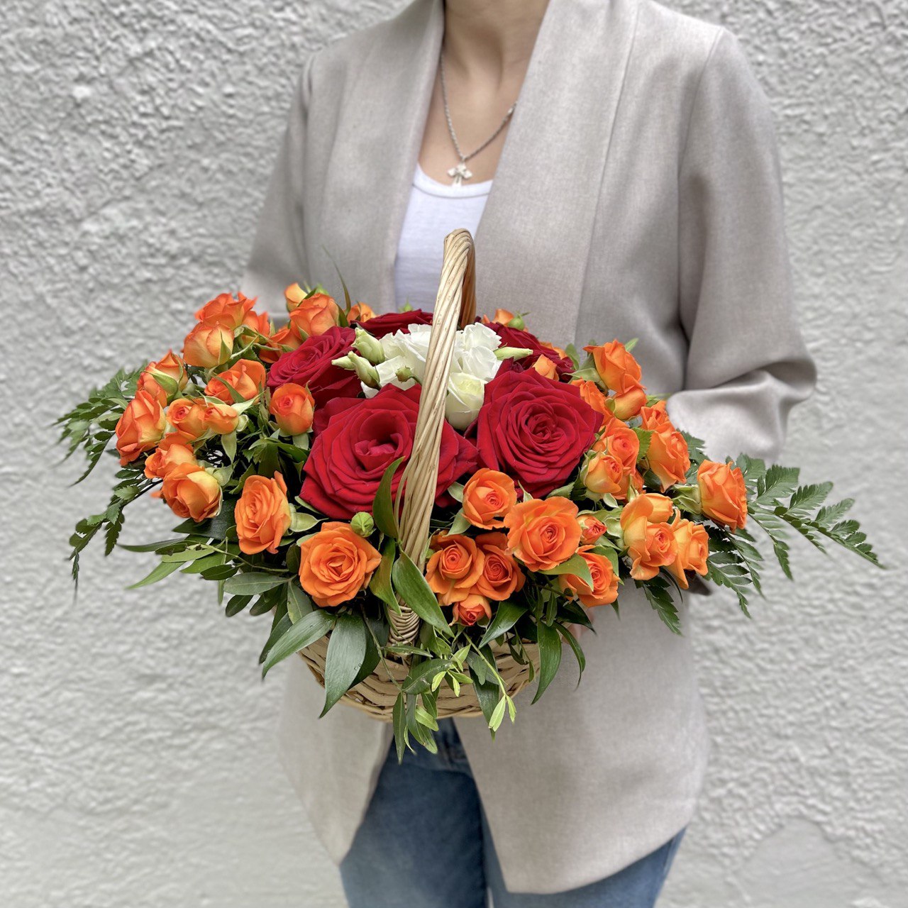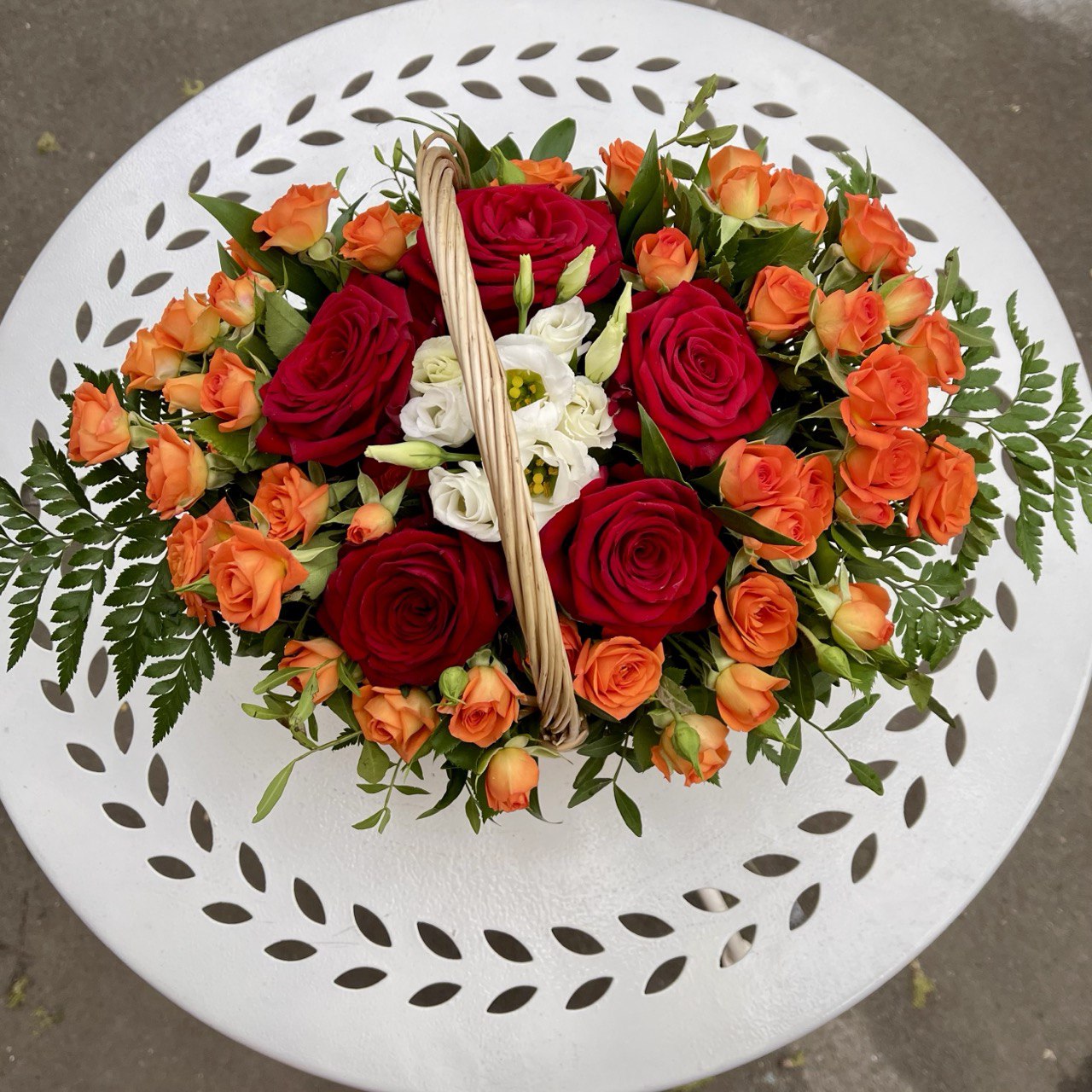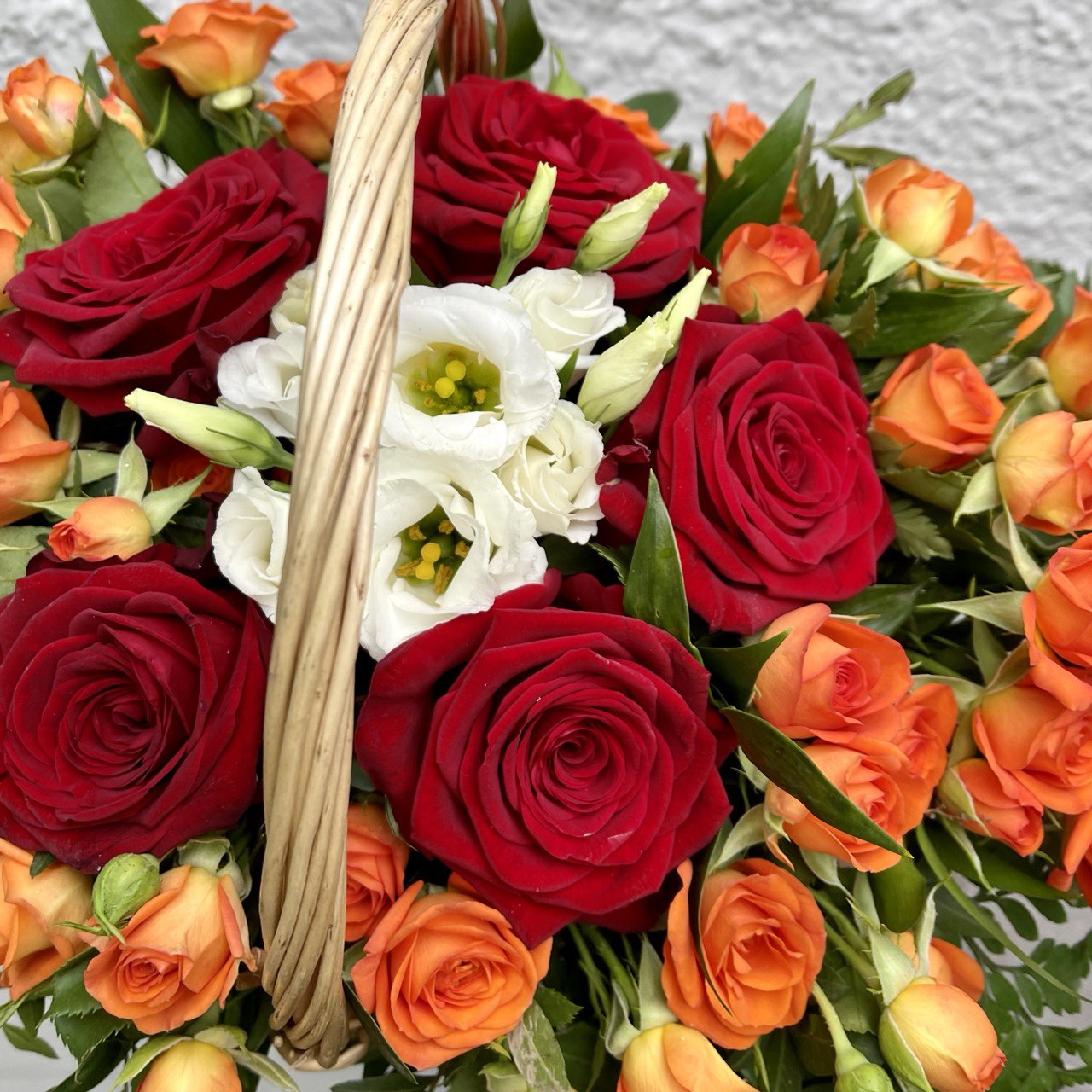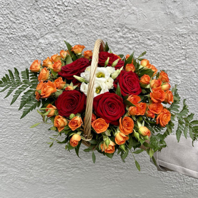 Роза кустовая оранжевая — 10 шт., роза «Ред Наоми» — 5 шт., эустома «Розита» — 1 шт., зелень, корзина малая, флористическая губка.