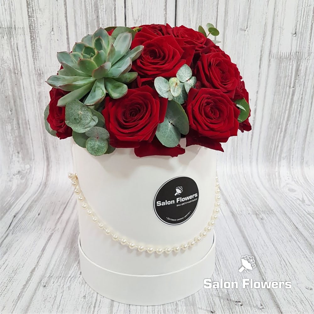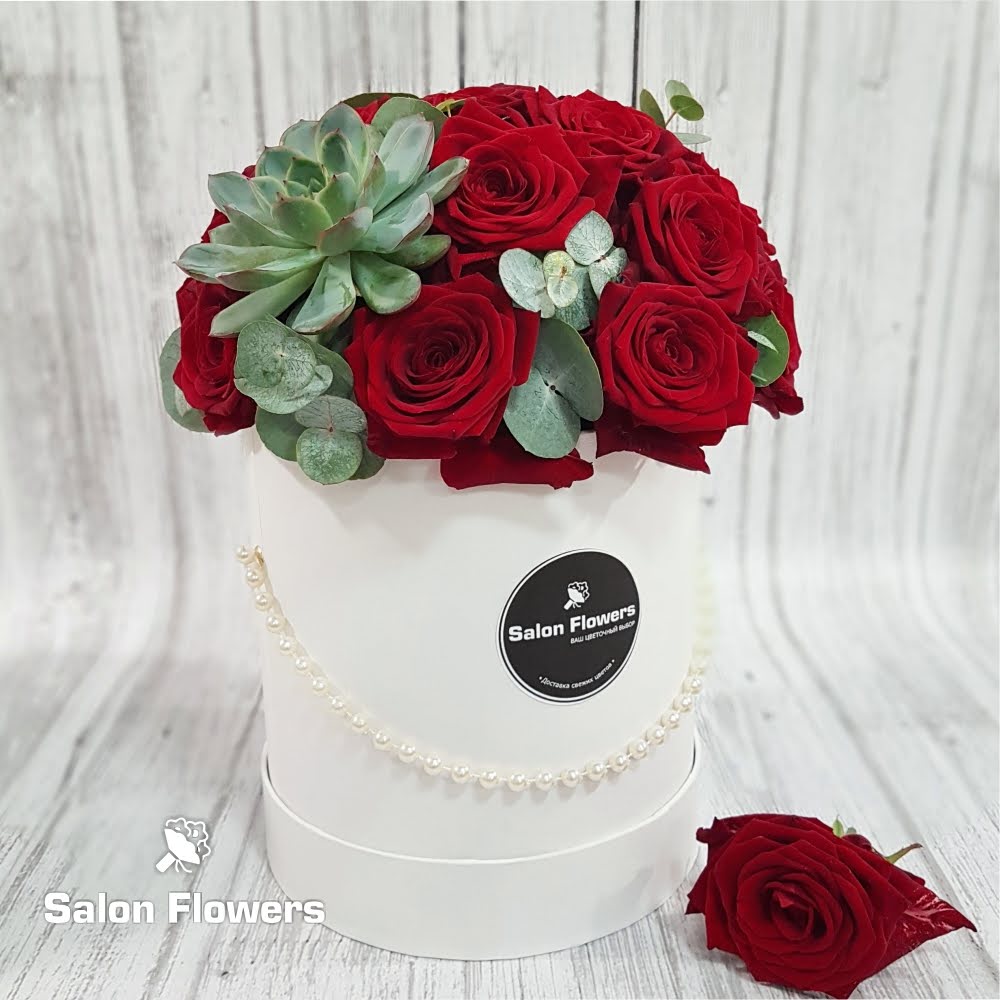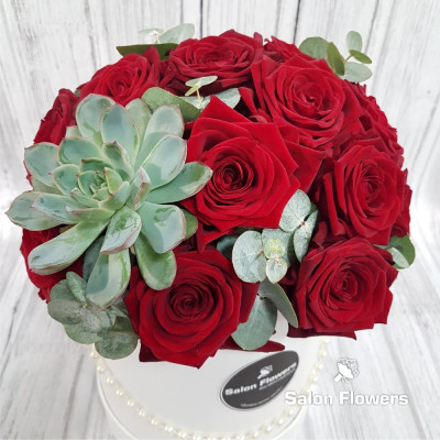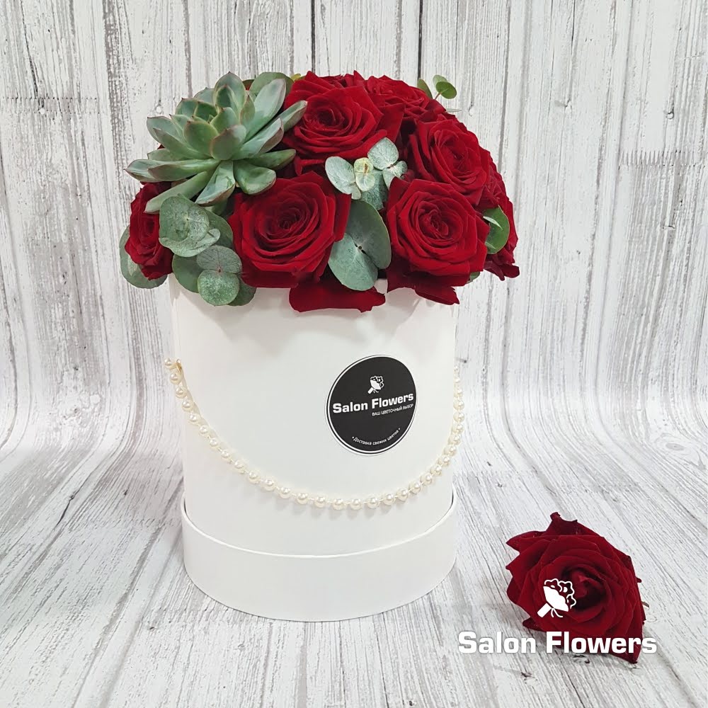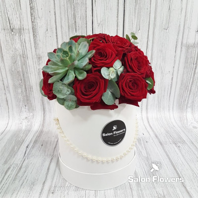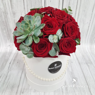 Роза «Россия Ред Наоми» — 19 шт., эхеверия — 1 шт., эвкалипт, шляпная коробка 18х20 см., флористическая губка, бусы.
