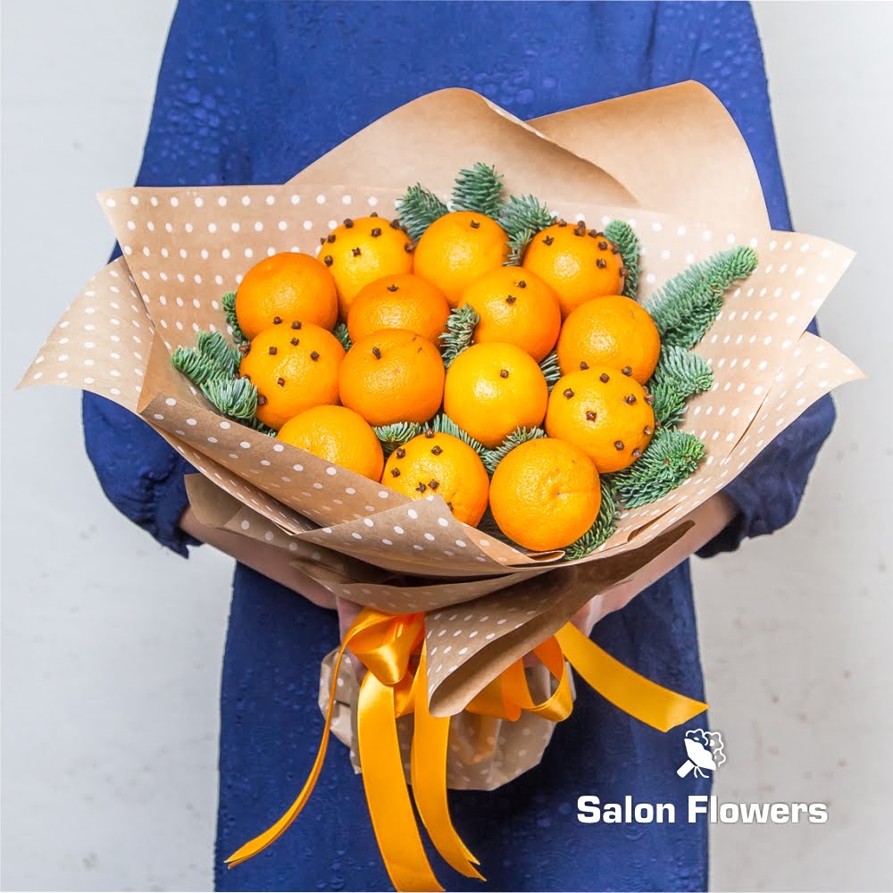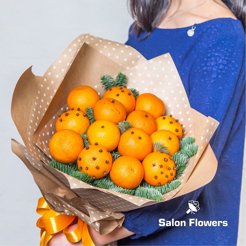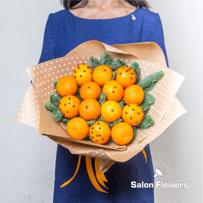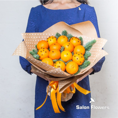 Букет дышит атмосферой праздника: цитрусовая свежесть мандаринов мягко переплетается с пряным ароматом гвоздики и хвойной прохладой ели. Сочные плоды и пушистые ветви создают гармоничное единство, где каждый элемент дополняет друг друга. Это не просто букет — это маленькое воплощение новогоднего чуда, способное подарить тепло и радость.