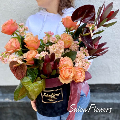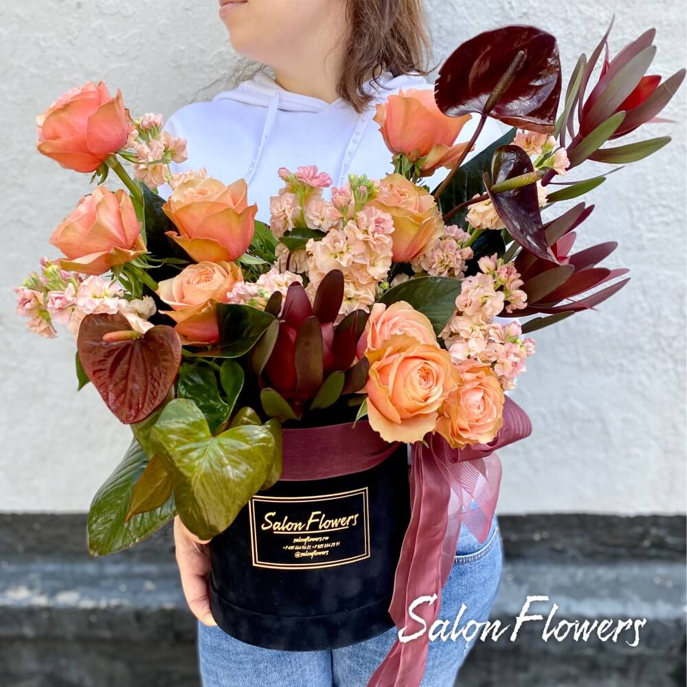 Роза «Эквадор Кахала» — 9 шт., маттиола кустовая ма— 10 шт., леукадендрон (сафари) — 3 шт., антуриум — 3 шт., зелень, бархатная коробка (18 х 20 см), флористическая губка, атласная лента.