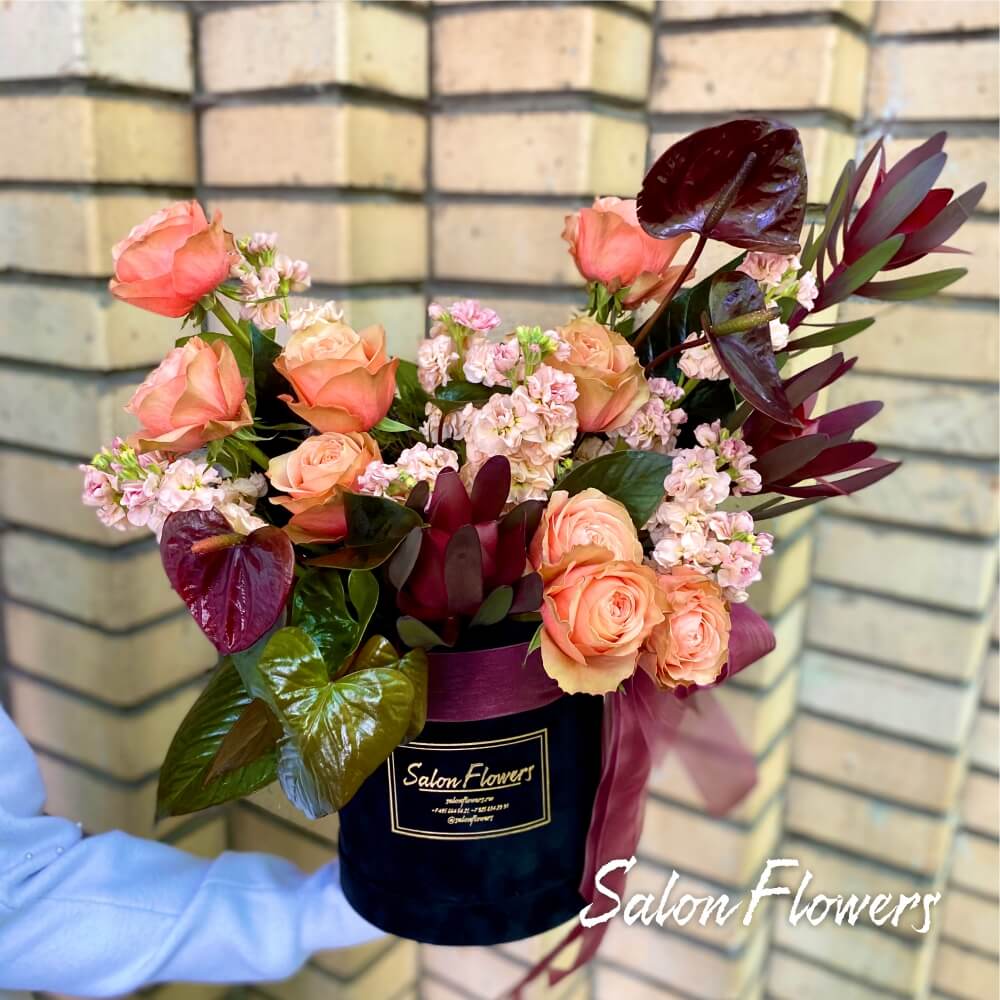 Он упакован в бархатную коробку 18х20 см., которая подчеркнет его роскошь и изысканность. Дополнительно к букетам прилагается флористическая губка для сохранения свежести цветов и атласная лента для декоративной отделки.