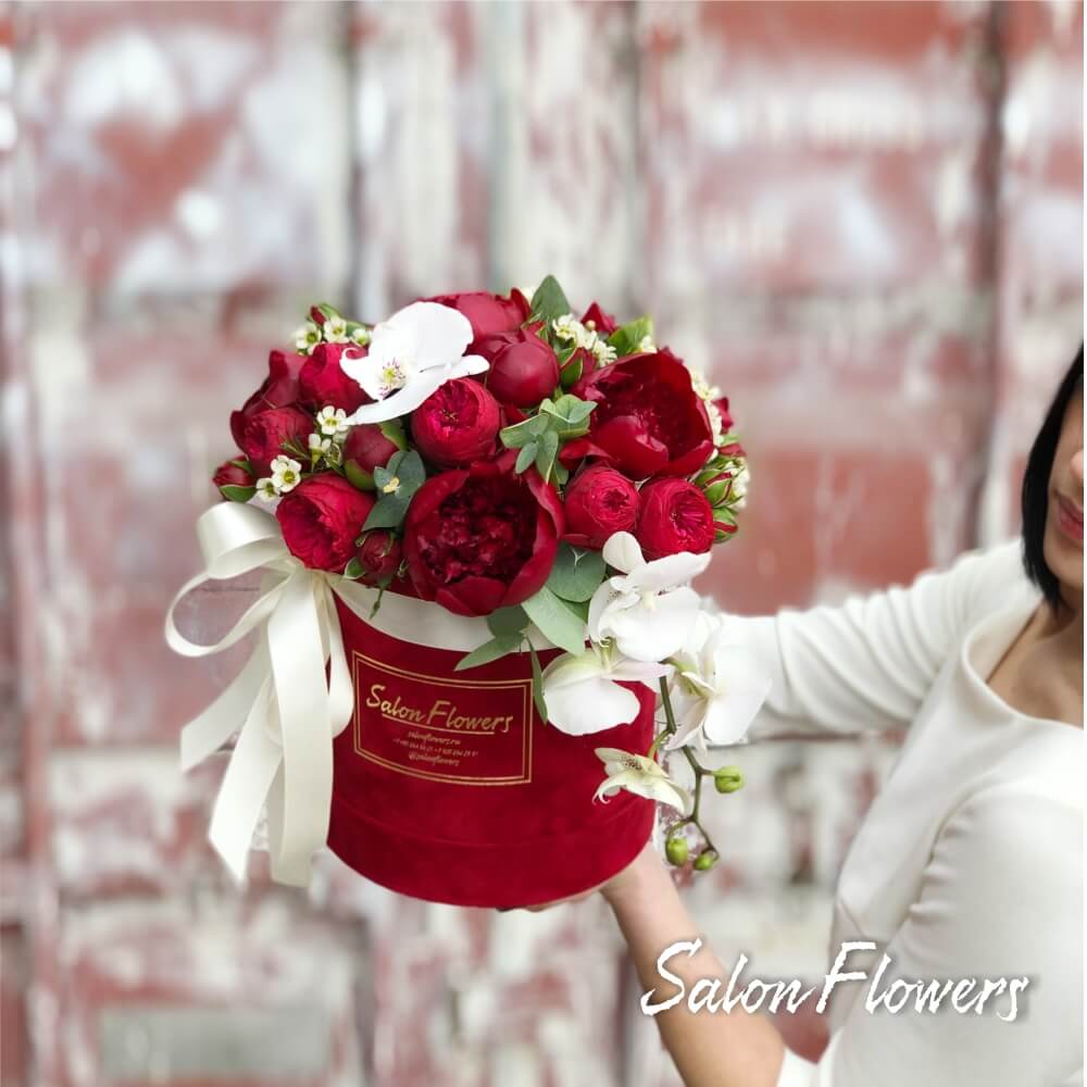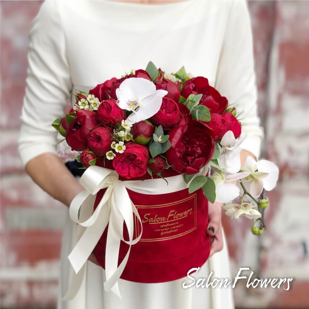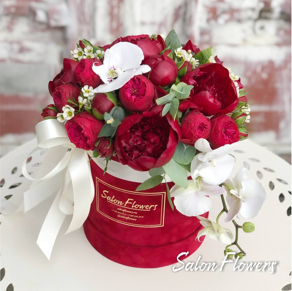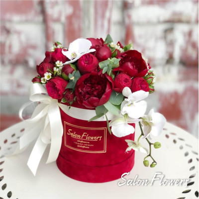 Пион «Ред Шарм» — 10 шт., роза пионовидная кустовая «Ред Пиано» — 5 шт., хамелациум, орхидея (фаленопсис) — 1 ветка, эвкалипт, бархатная коробка (18 х 20 см), флористическая губка, атласная лента.