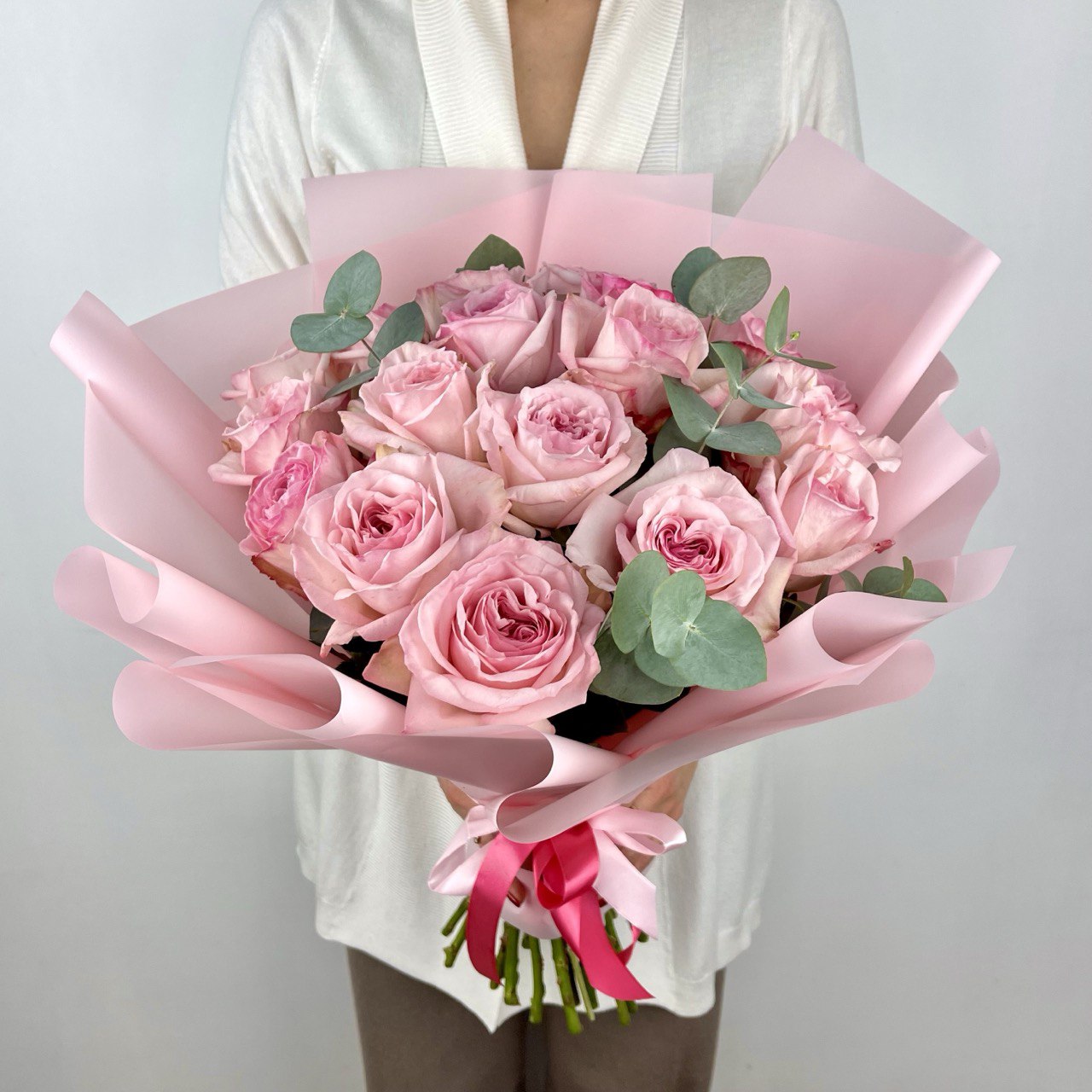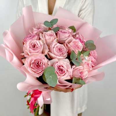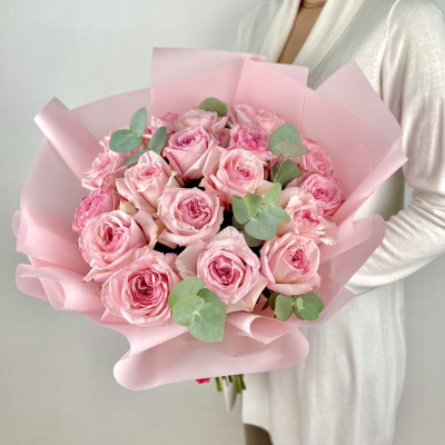 Пионовидная роза «Пинк Охара» — 19 шт., эвкалипт, фирменная упаковка, атласная лента.