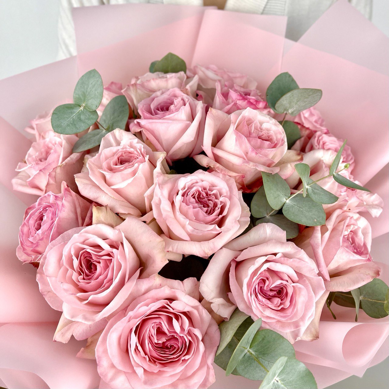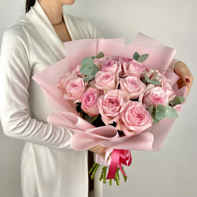 Изысканный эвкалипт, деликатно обрамляющий розы, привносит в композицию свежесть и лёгкость. Его выразительные зелёные ветви создают гармоничный контраст с розовой гаммой, придавая букету элегантную «садовую» форму и дополняя его природной чистотой.