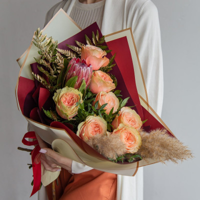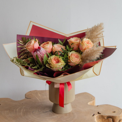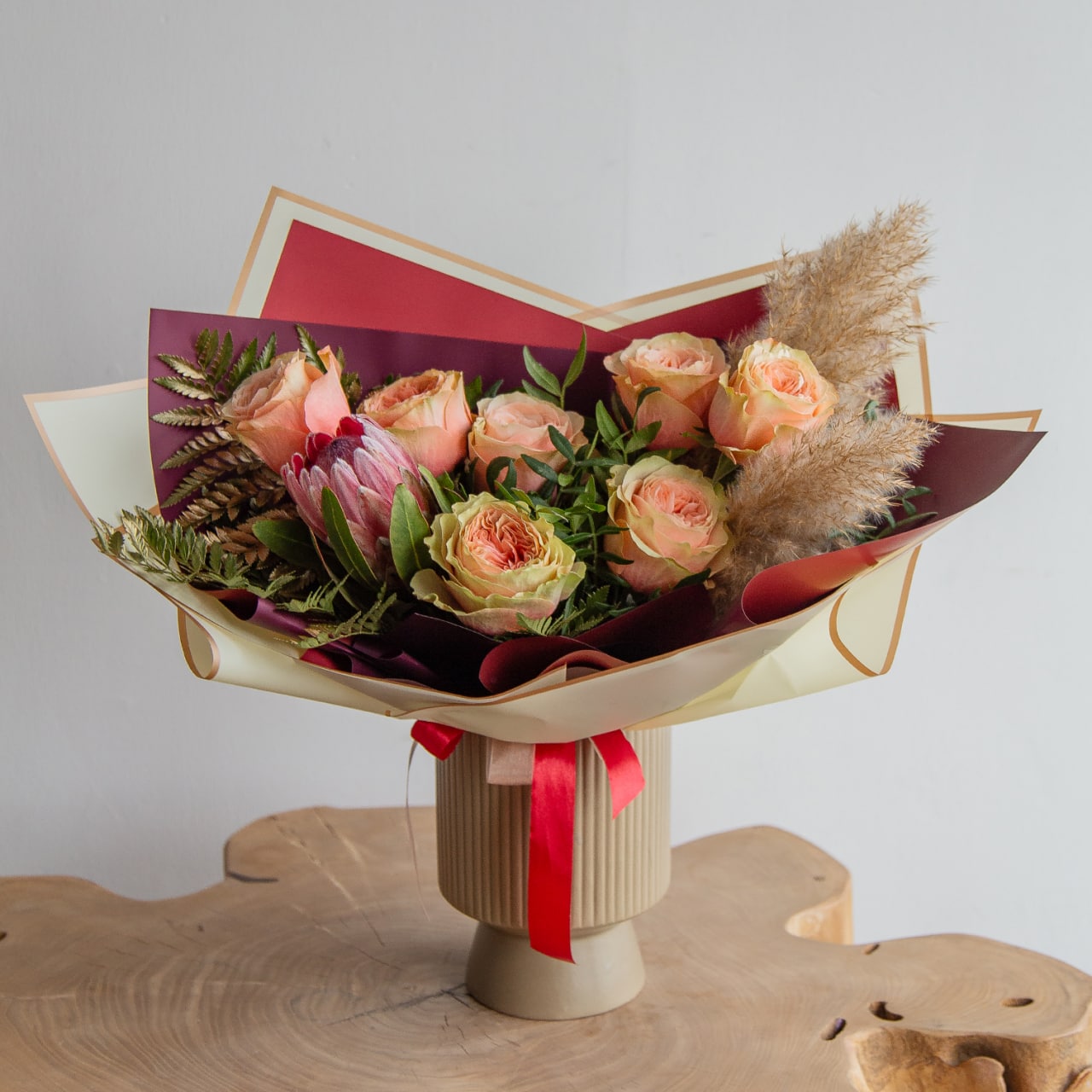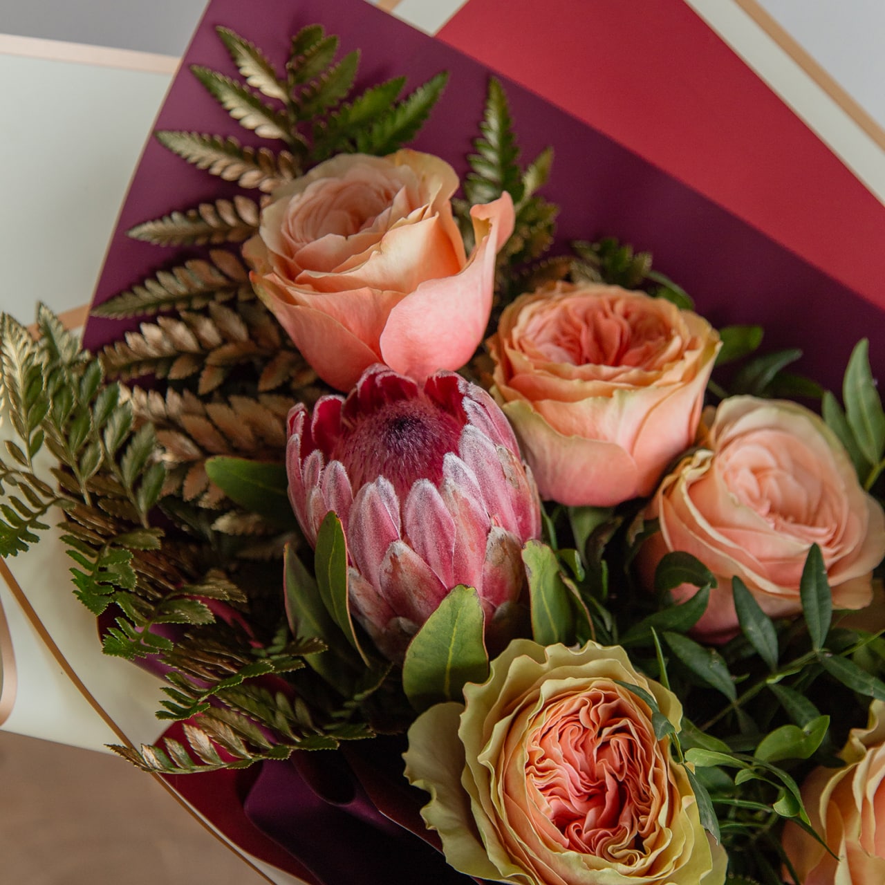 Нежный протея привносит в букет экзотическое звучание: её причудливые соцветия с бархатистой текстурой напоминают застывшие капли росы на рассвете. Камыш добавляет графичную линию и природную естественность, а папоротник — воздушную ажурность, создавая объём и глубину композиции.