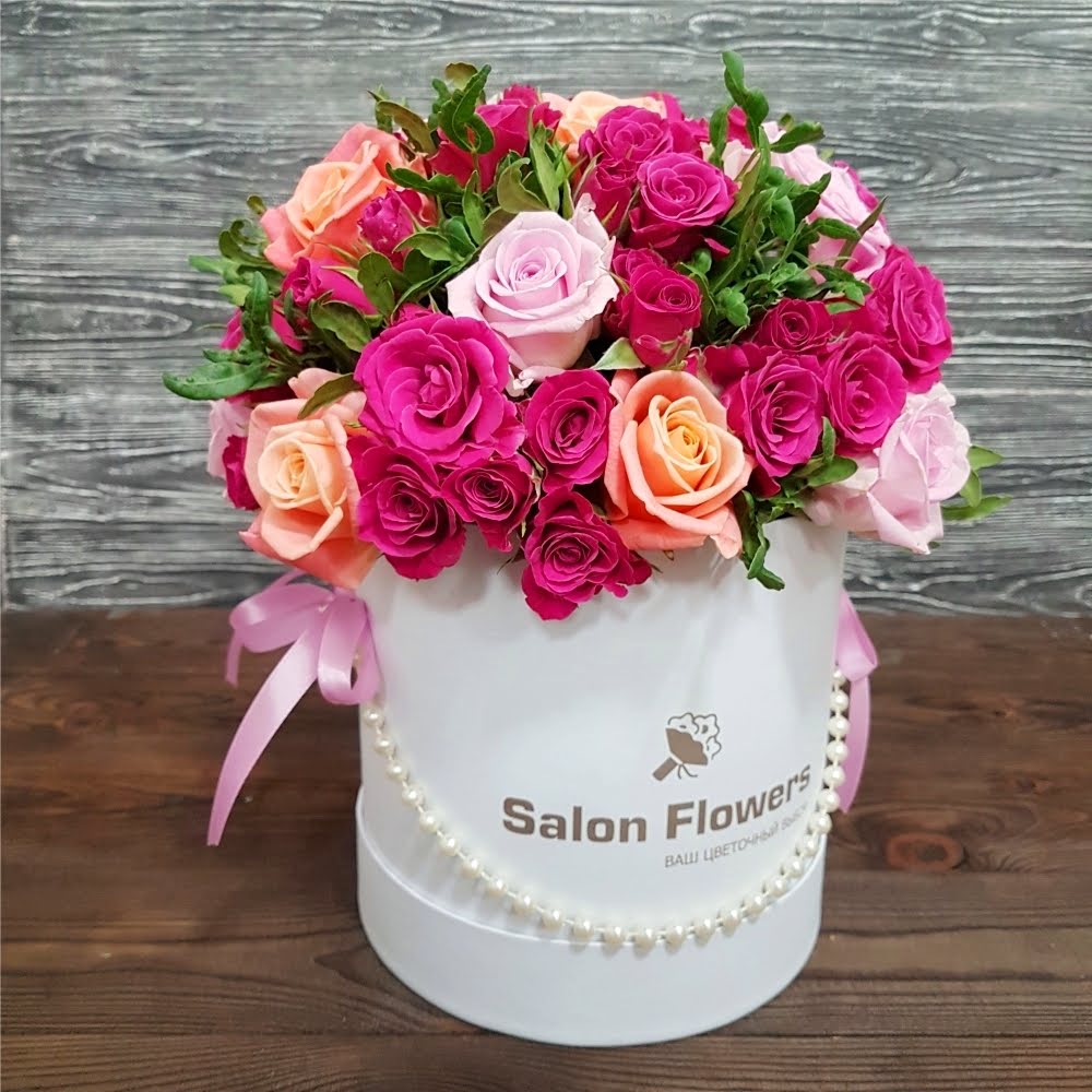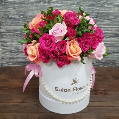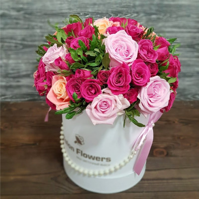 Роза кустовая малиновая — 10 шт., роза одноголовая микс — 15 шт., коробка 18х20 см., флористическая губка, декор — бусы.