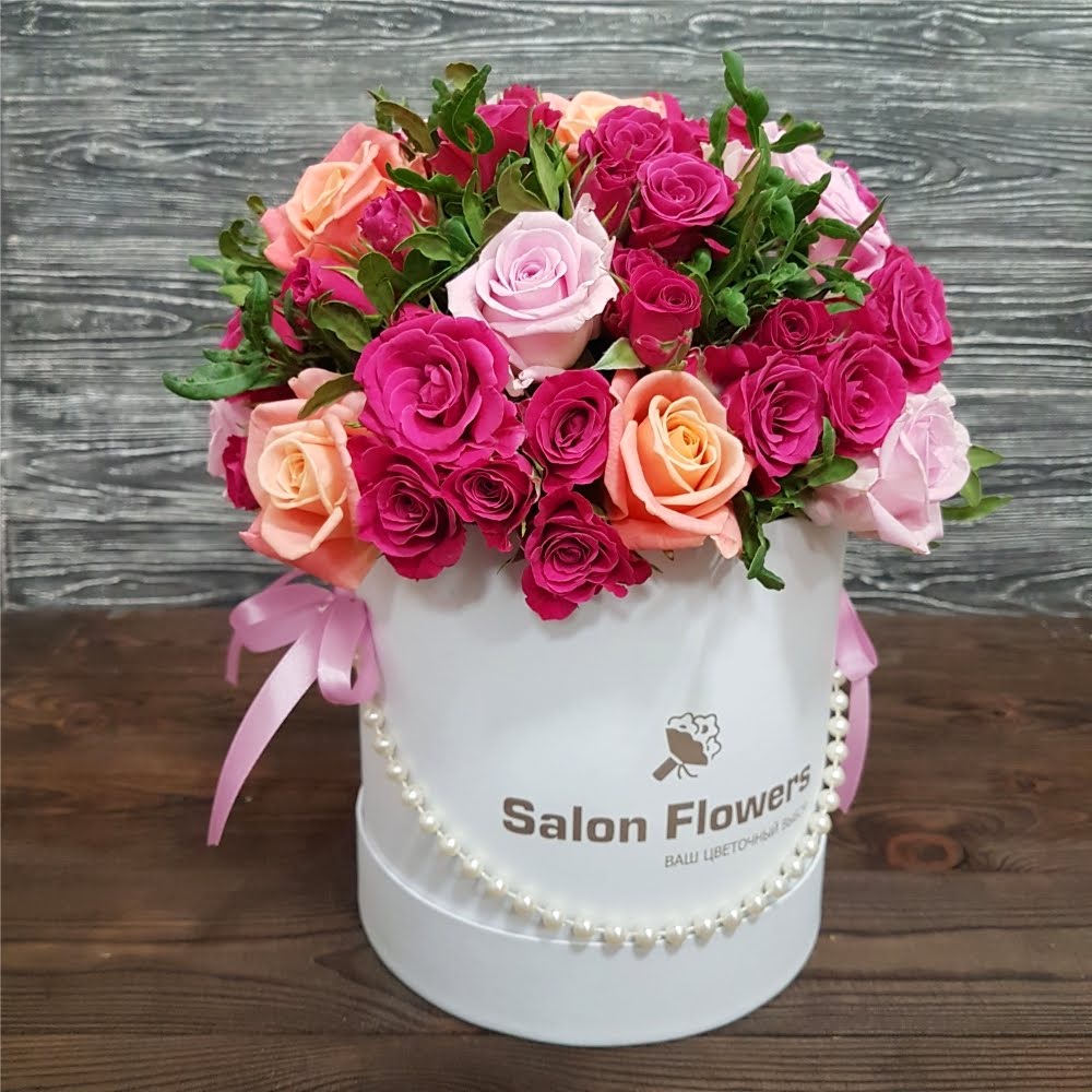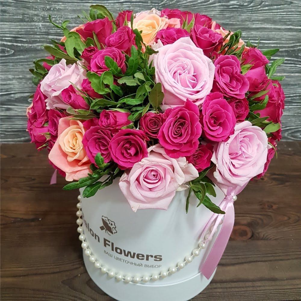 Всё это бережно размещено в элегантной шляпной коробке, чьё лаконичное оформление становится идеальным фоном для цветочного великолепия. Особую ноту роскоши добавляют декоративные бусины: они деликатно обрамляют композицию, придавая ей изысканный, почти ювелирный шарм.