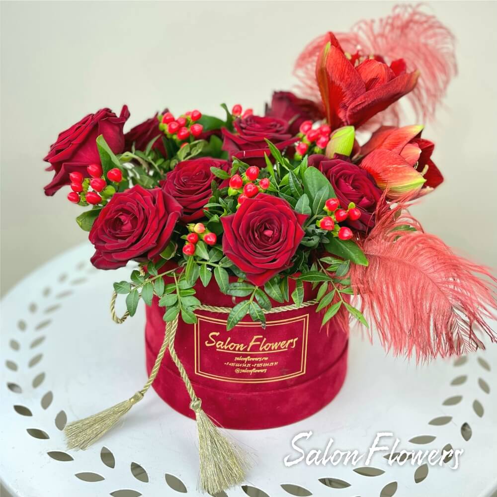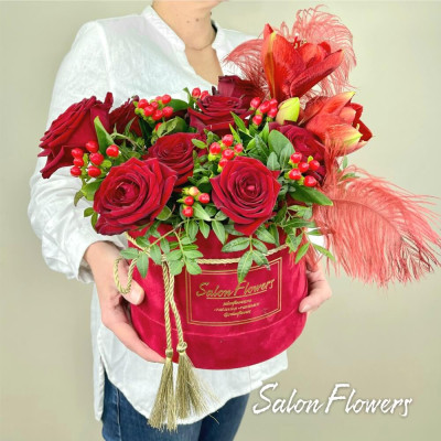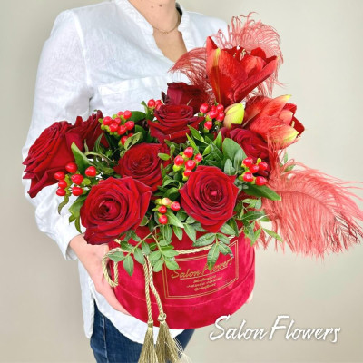 Роза «Россия ред наоми» — 9 шт., амариллис красный — 1 шт., гиперикум красный — 3 шт., писташ, перья — 2 шт., бархатная коробка (20 х 15 см), флористическая губка, золотой жгут.