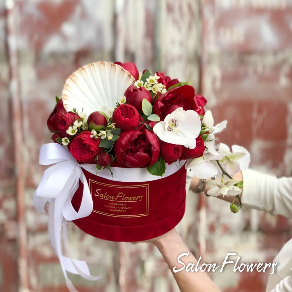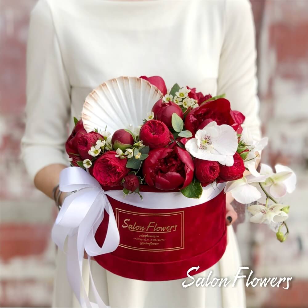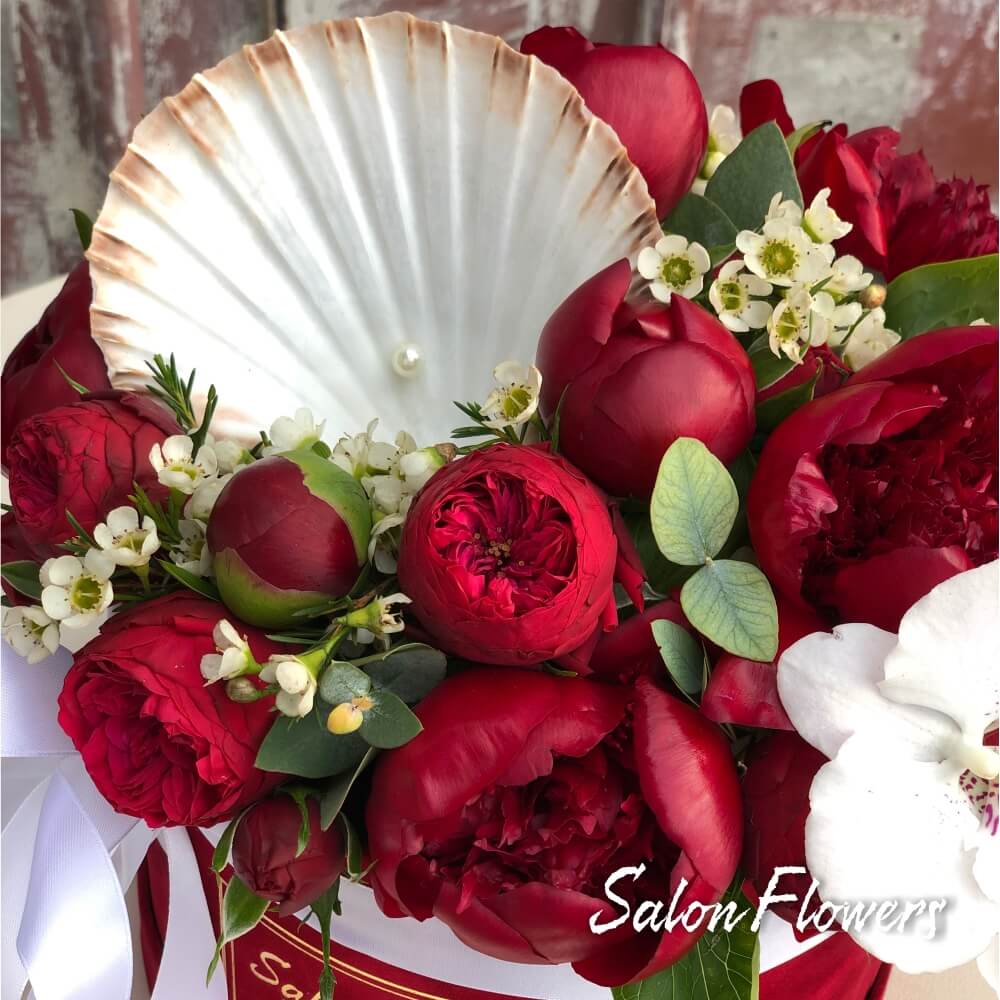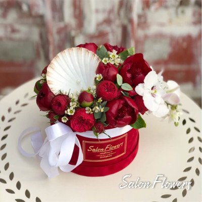Пион «Ред Шарм» — 10 шт., роза «Ред Пиано» — 5 шт., хамелациум — 2 шт., орхидея фаленопсис — 1 ветка, эвкалипт, ракушка, бусина, бархатная коробка (20 х 15 см), флористическая губка, атласная лента.