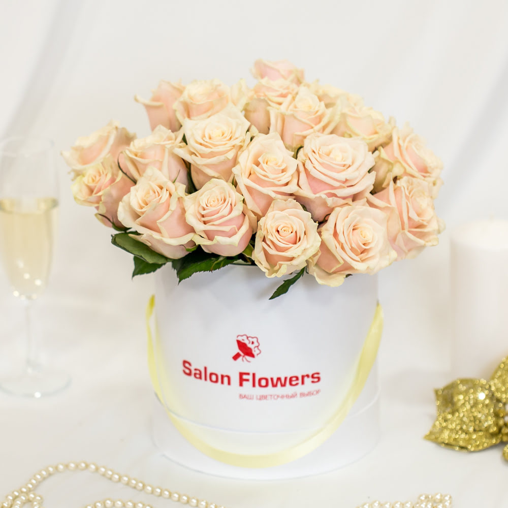 Цветы в шляпной коробке «Нежное счастье» — трепетное признание, воплощённое в девятнадцати розах «Россия Талея». Размещённые в изящной шляпной коробке, они складываются в композицию, где каждая линия, каждый оттенок рассказывают тихую историю о чувстве, лишённом пафоса, но полном глубины.