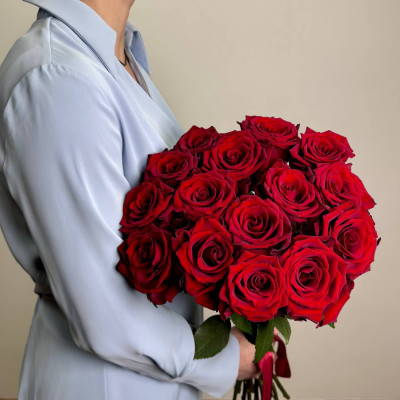 Насыщенно‑красные, с бархатистыми лепестками и пышными бутонами, розы выглядят роскошно и выразительно. Их глубокий оттенок передаёт силу чувств, а стройные стебли придают композиции благородную строгость. Лёгкий аромат дополняет образ, не перегружая его.