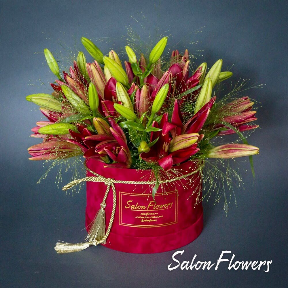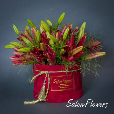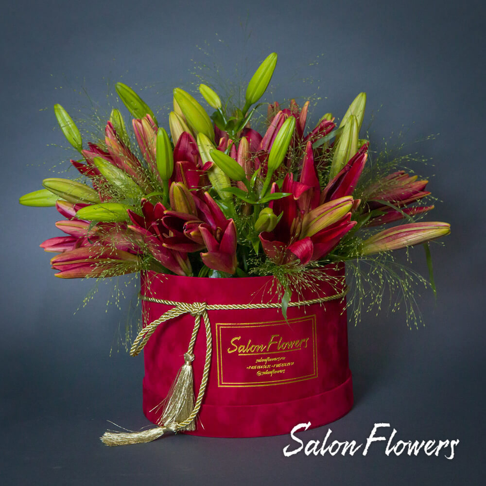 Лилия азиатка (без аромата) — 9 шт., паникум — 10 шт., шляпная коробка (20 х 15 см), флористическая губка, атласная лента.