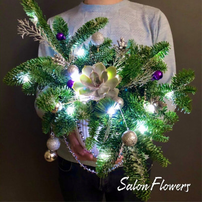 Среди изумрудных ветвей притаились самые душевные атрибуты праздника: яркие новогодние игрушки переливаются разноцветными огоньками, словно звёзды на рождественском небе; натуральные шишки добавляют природную теплоту и лесной колорит; изящные бусы струятся серебристыми ручейками, создавая игру света и тени. Нежные розетки эхеверии вносят утончённый акцент, контрастируя с хвойной пышностью и придавая композиции особую изысканность.