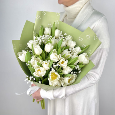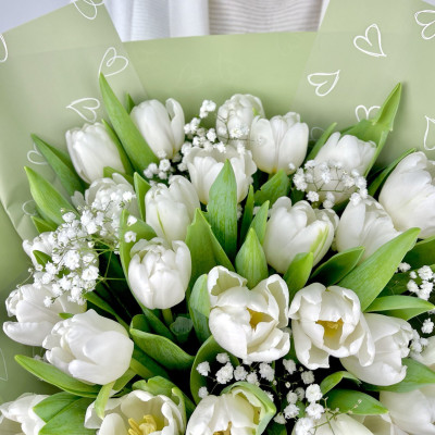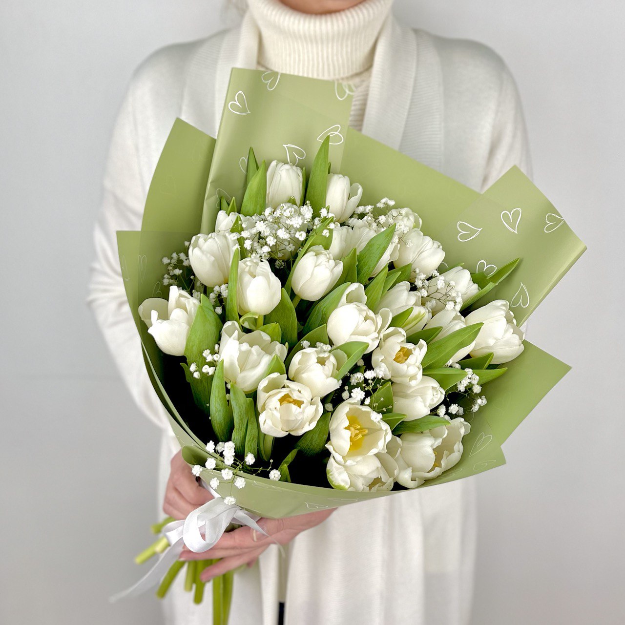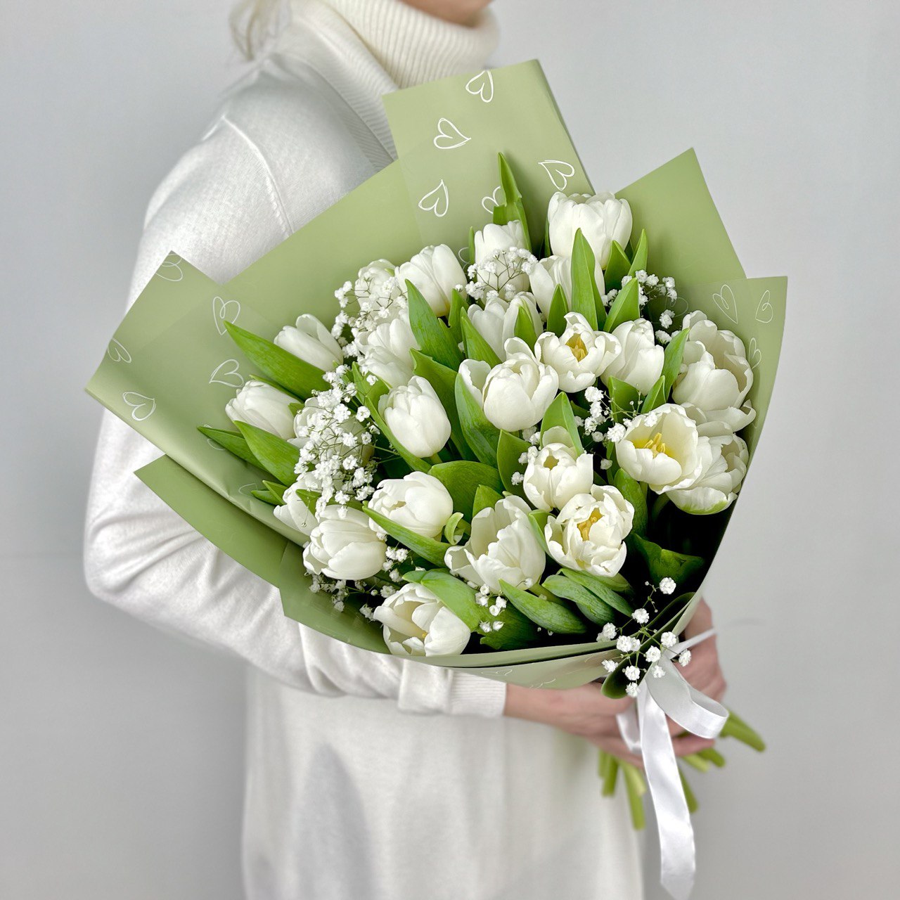 Тюльпан — 25 шт., гипсофила — 2 шт., фирменная упаковка, атласная лента.