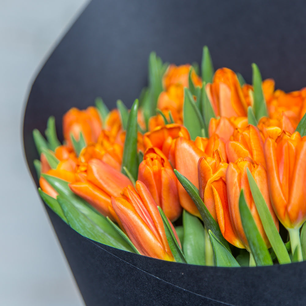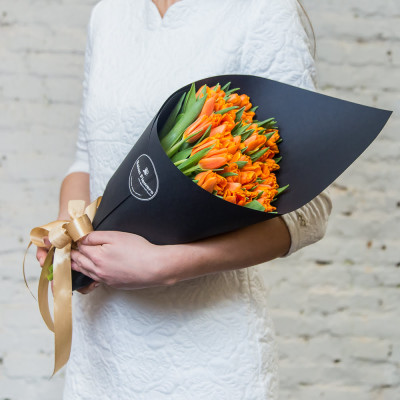 Тюльпан рыжий — 49 шт., фирменная упаковка, атласная лента.