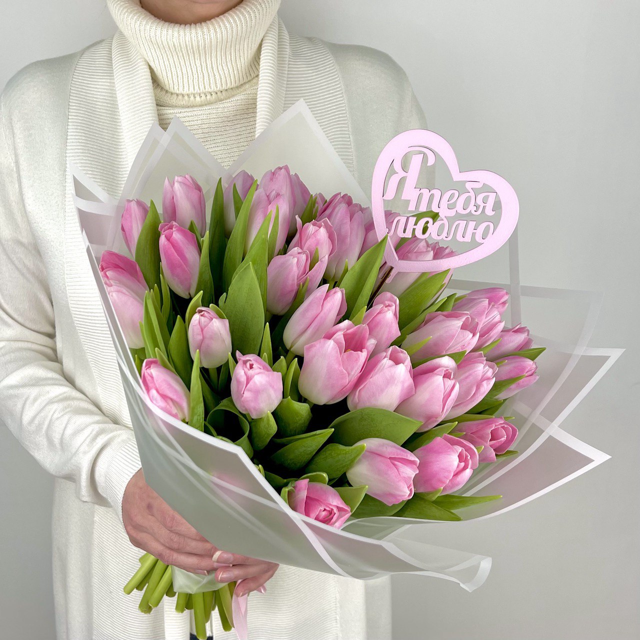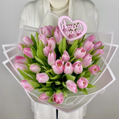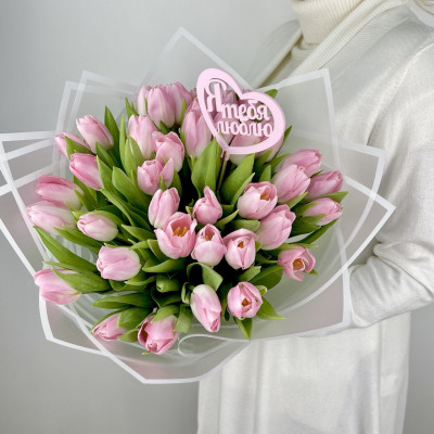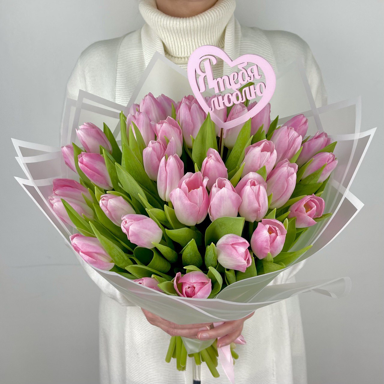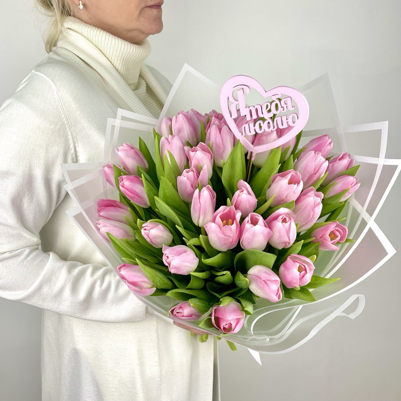 Тюльпан — 49 шт., топпер — 1 шт., фирменная упаковка, атласная лента.