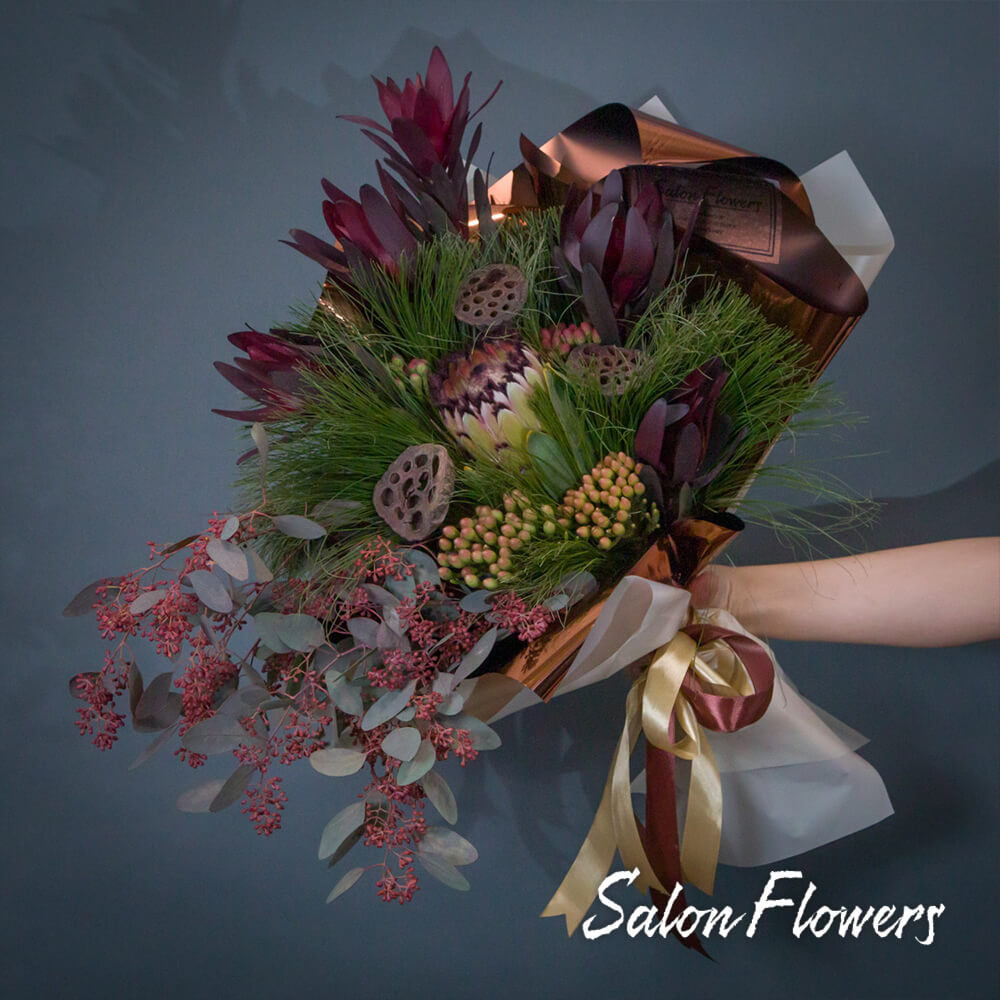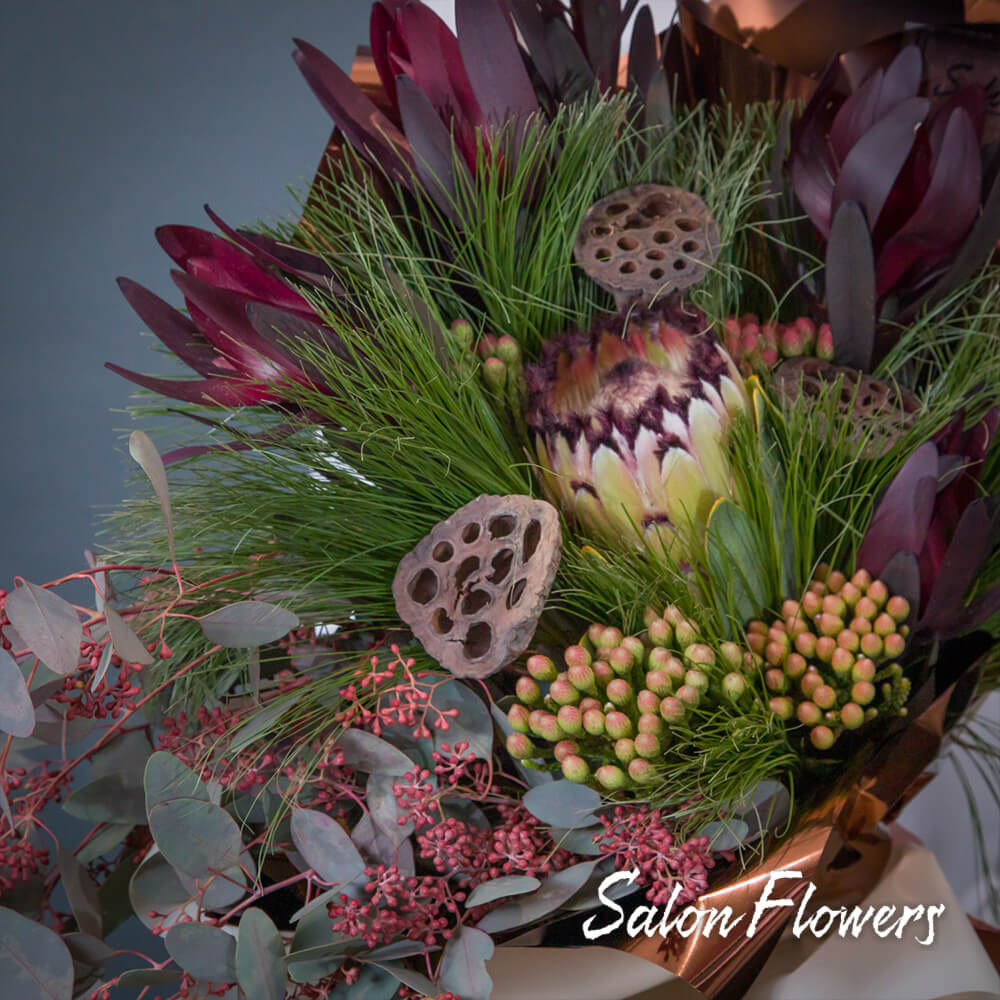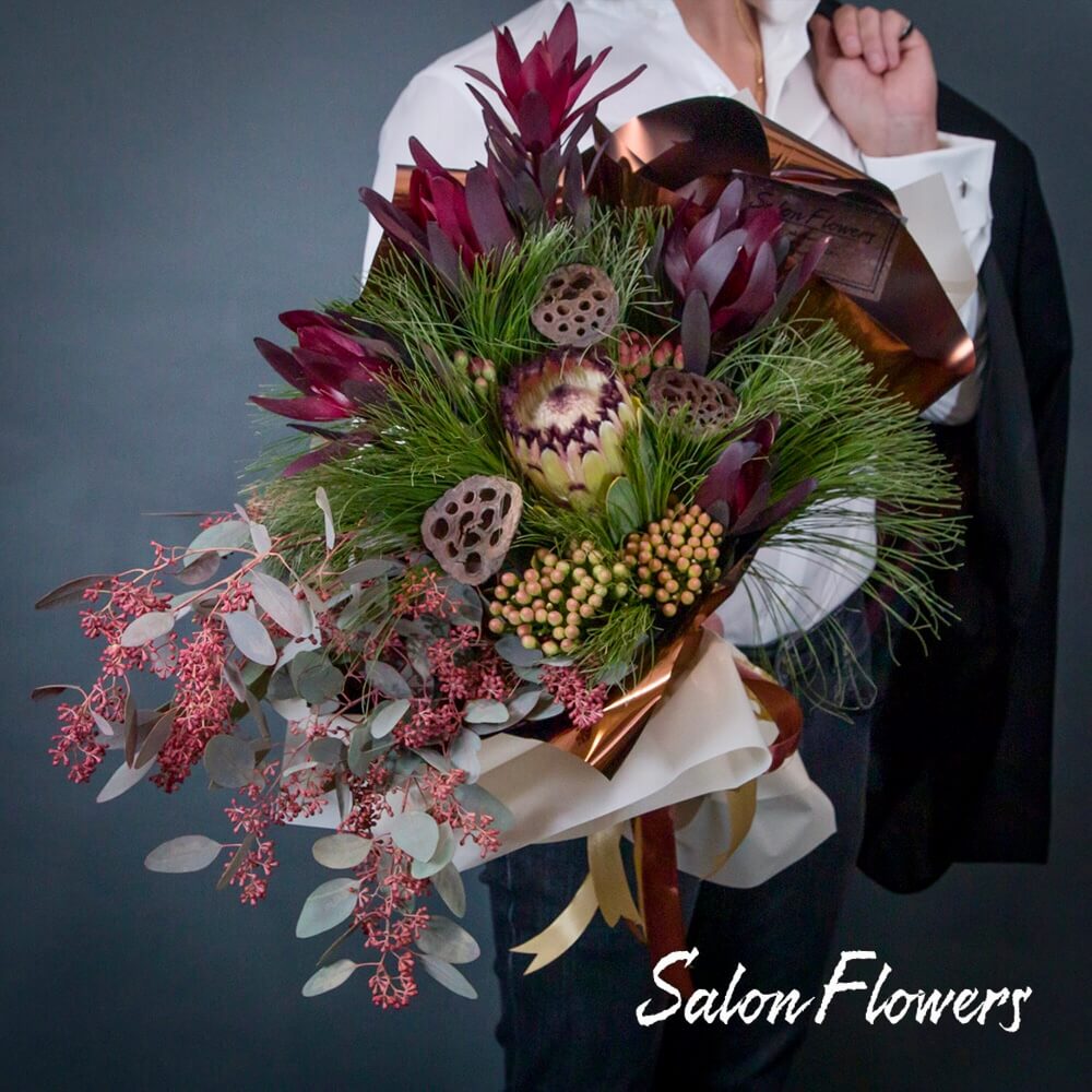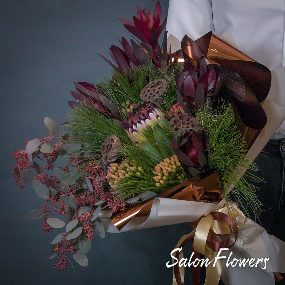 Леукадендрон (Сафари) с его пышными соцветиями привносит в букет нотку яркости и динамизма. Протей, как королевский цветок, добавляет изюминку роскоши и благородства.
