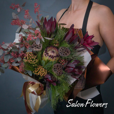 Леукадендрон (Сафари) — 5 шт., протея — 1 шт., папирус или сосна — 5 шт., бруния — 3 шт., лотос — 3 шт., эвкалипт, фирменная упаковка, атласная лента.