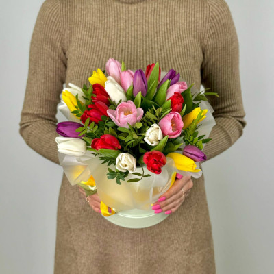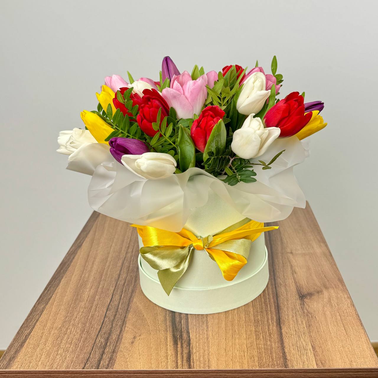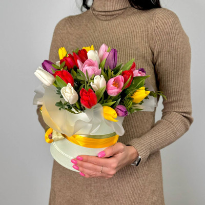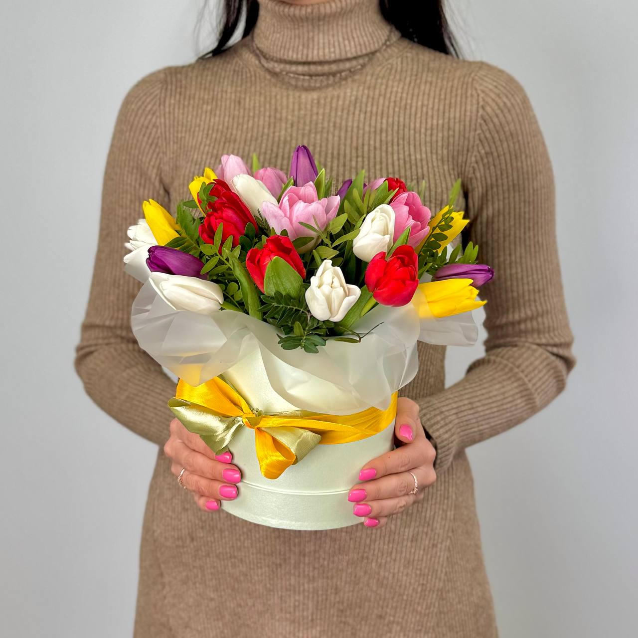 Весенние краски: 25 ярких тюльпанов в подарочной коробке – будоражащий подарок весны!