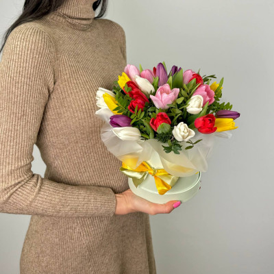 Микс тюльпанов — 25 шт., писташ, шляпная коробка (15 х 15 см), флористическая губка, атласная лента.