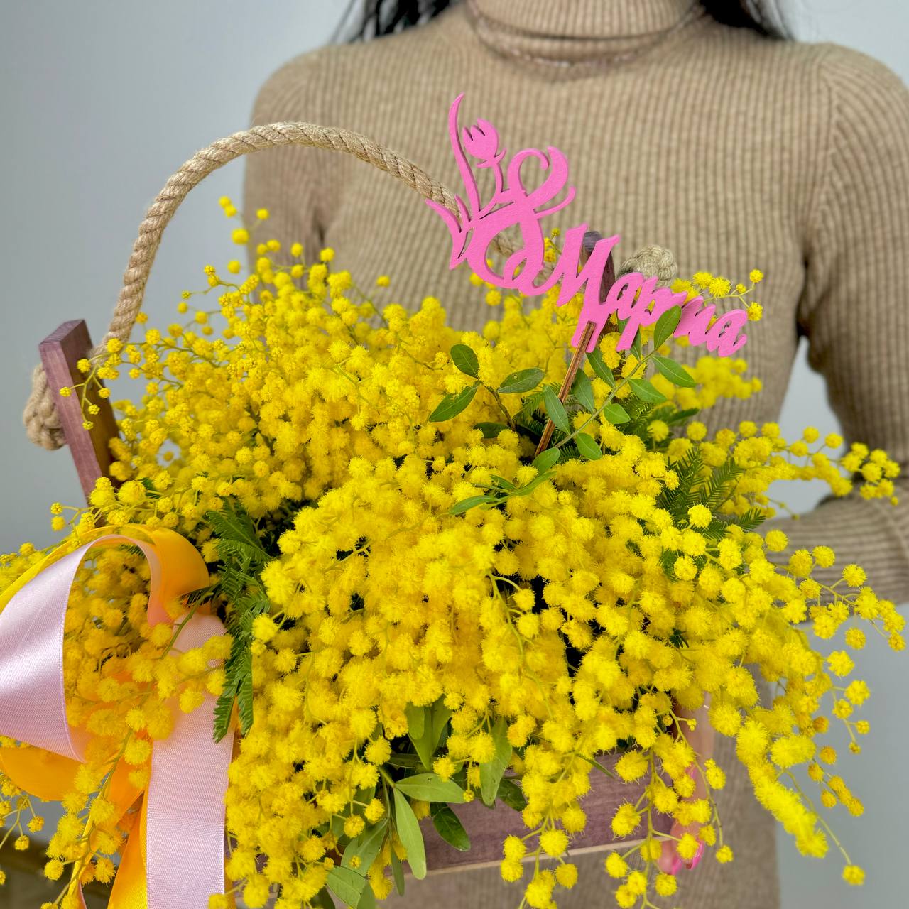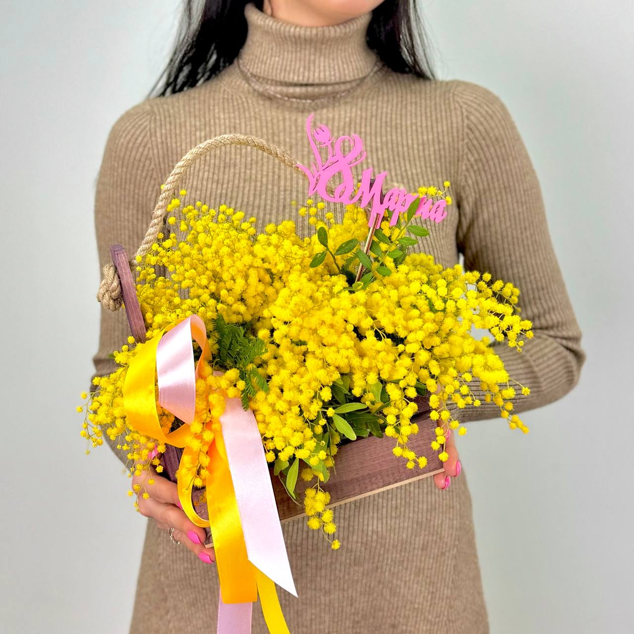 Мимоза «Итальянская» — 0,5 банча, зелень, деревянный ящик (20 х 23 см), топпер «8 марта», флористическая губка, атласная лента.