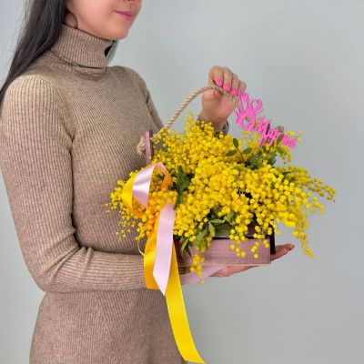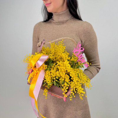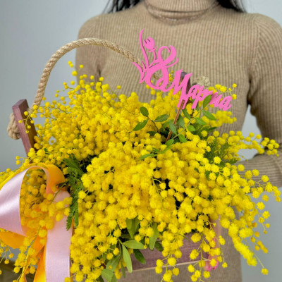 - Уникальный букет: мимоза «Итальянская» представлена в красивом деревянном ящике (20 х 23 см), дополненном свежей зеленью и стильным топпером «8 марта».