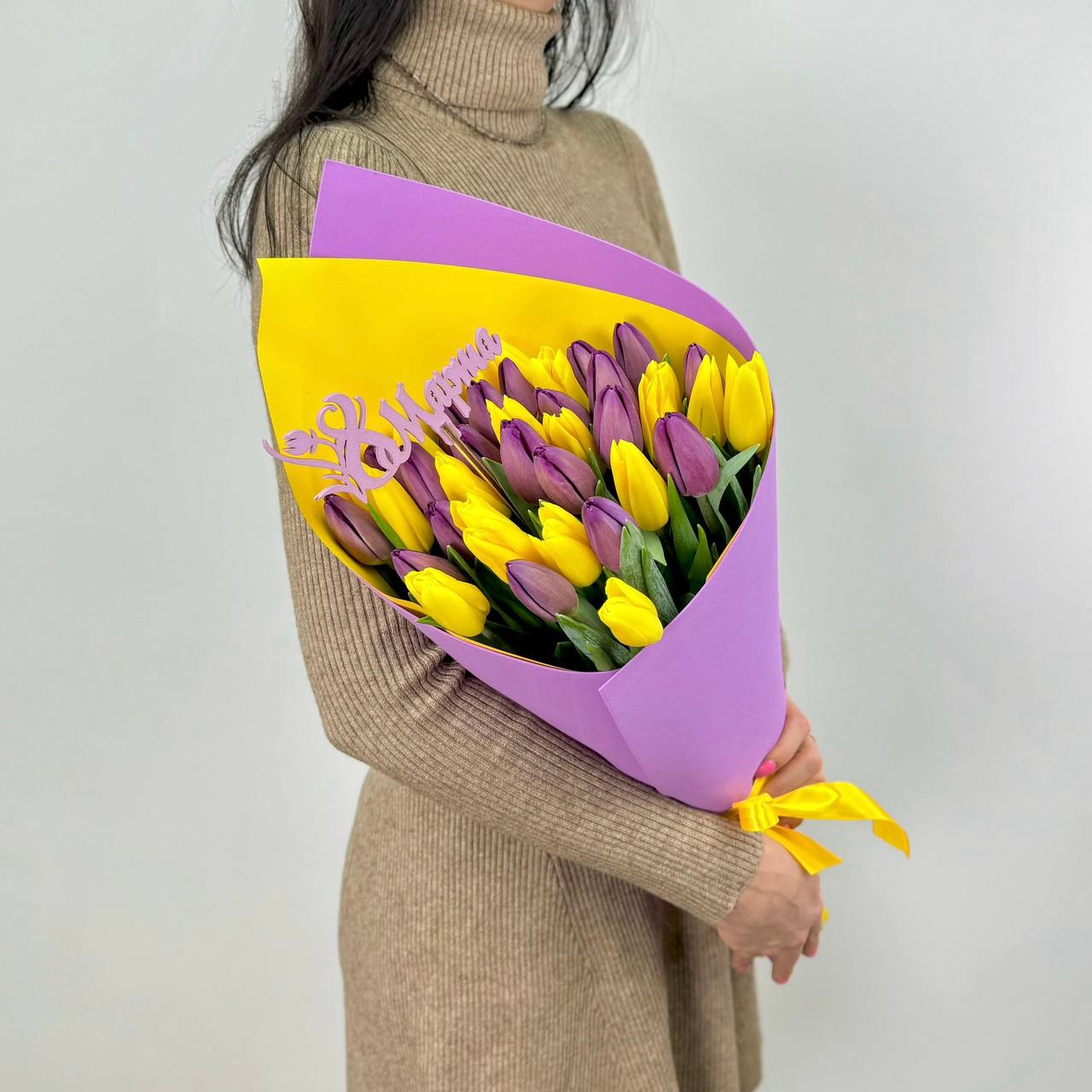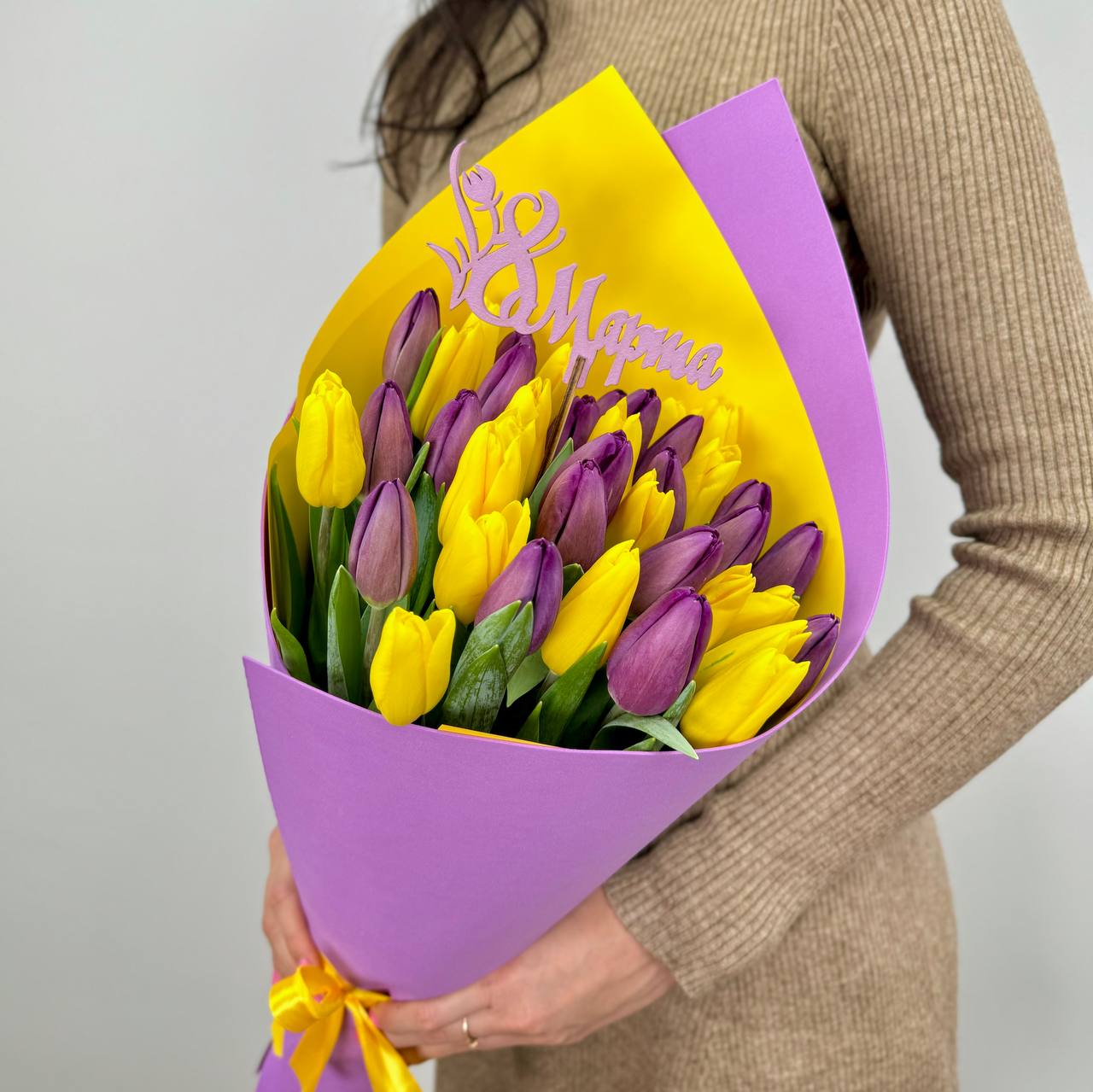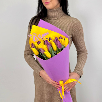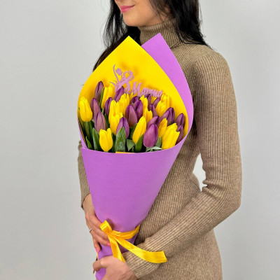 Тюльпан желтый — 20 шт., тюльпан фиолетовый — 19 шт., топпер «8 Марта», фирменная упаковка, атласная лента.