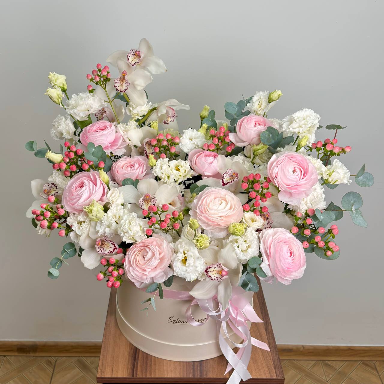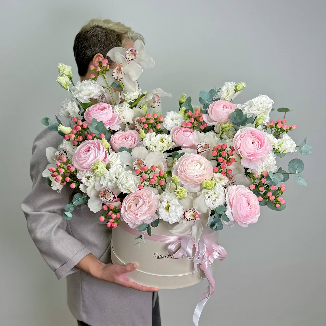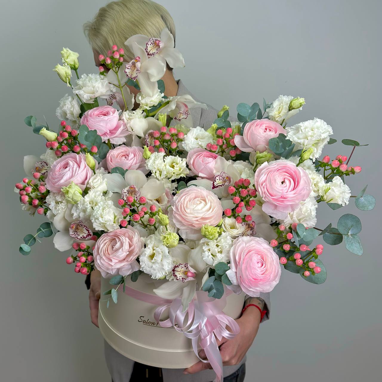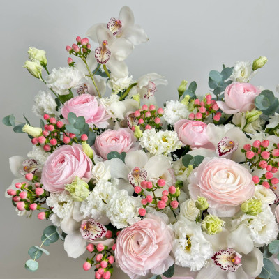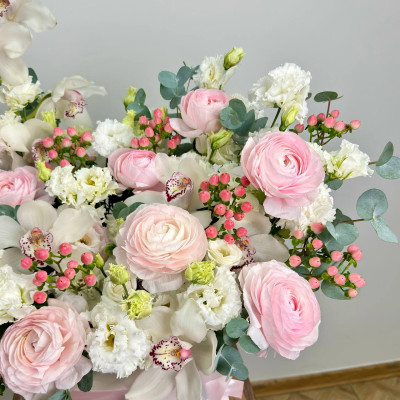 Ранункулюс розовый — 10 шт., орхидея (цимбидиум) — 10 шт., эустома «Алиса Вайт» — 10 шт., гиперикум розовый — 10 шт., зелень, эвкалипт, удлинитель — 10 шт., шляпная коробка 30х20 см., юбочка, флористическая губка, атласная лента.