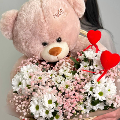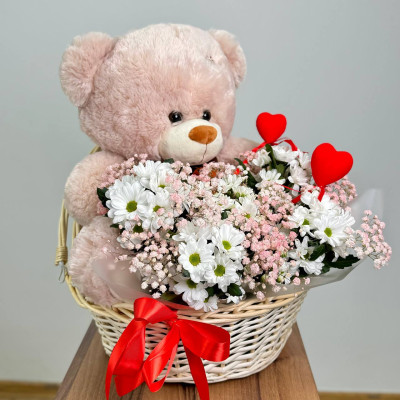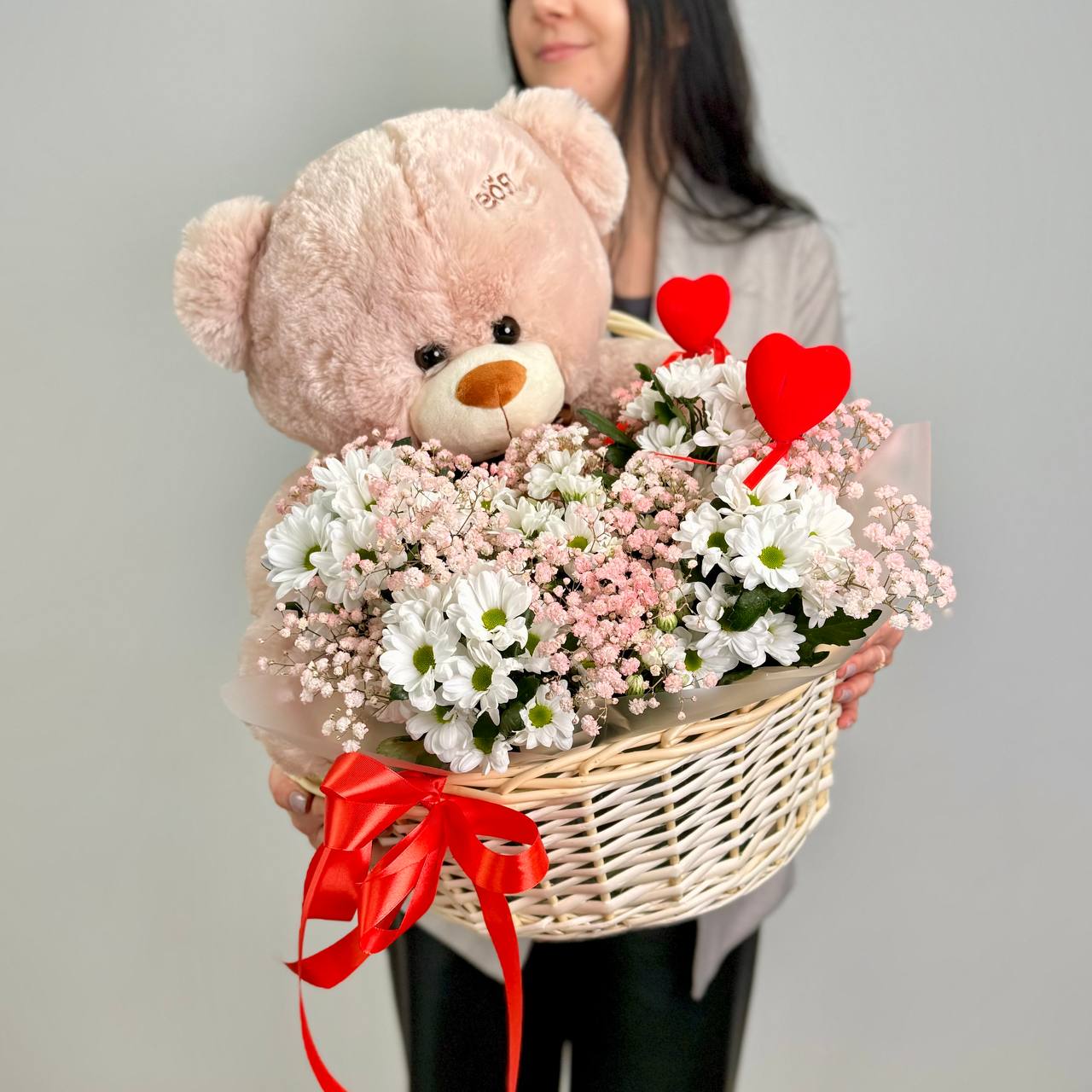 Хризантема кустовая — 5 шт., гипсофила — 3 шт., мягкая игрушка «Мишка» — 1 шт., топпер-сердце — 2 шт., корзина средняя, юбочка, флористическая губка, атласная лента.