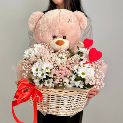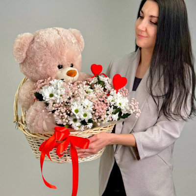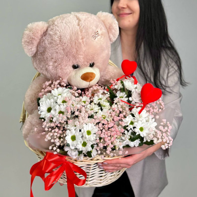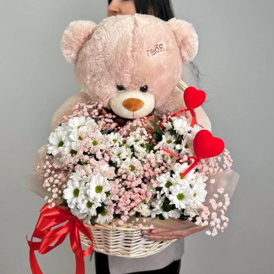 Сочетание цветов, игрушки и стильной корзины создаёт впечатление щедрости и заботы. Хризантемы долго сохраняют свежесть, а гипсофила остаётся красивой даже после увядания основных цветов. Корзина служит не только упаковкой, но и вазой для цветов, а мягкая игрушка станет верным другом на долгие годы.