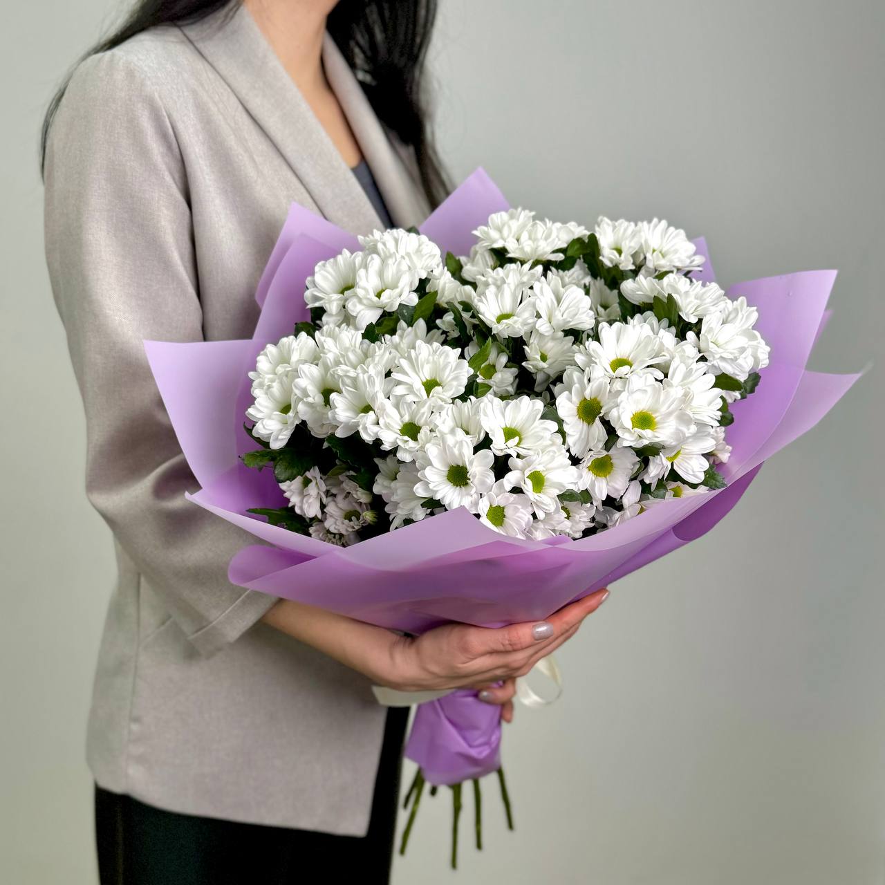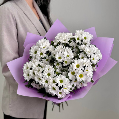 Каждый цветок в этом букете словно излучает свежесть и чистоту: пышные соцветия, будто сотканные из утреннего тумана, очаровывают природной грацией и утончённой красотой. Хризантемы, известные как символ долголетия и искренней любви, здесь объединились в ансамбль, который дарит ощущение лёгкости и радости.